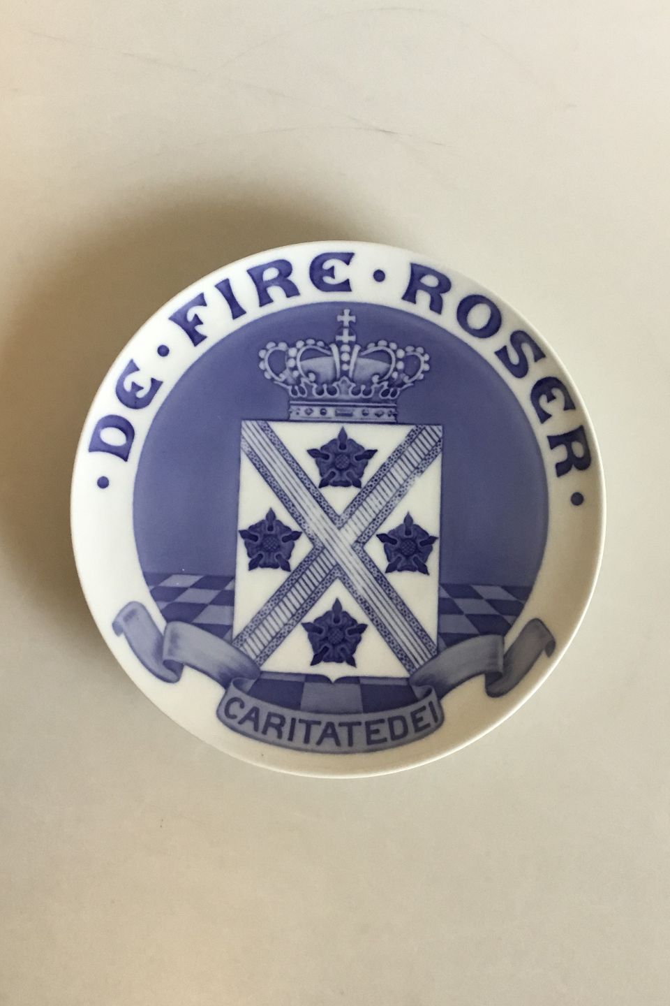 Royal Copenhagen Commemorative Plate from 1909 RC-CM100. Crowned shield with the cross of St. Andrew and four roses. Commissioned by the Freemason lodge of St. Andrew in Aarhus founded in 1908.