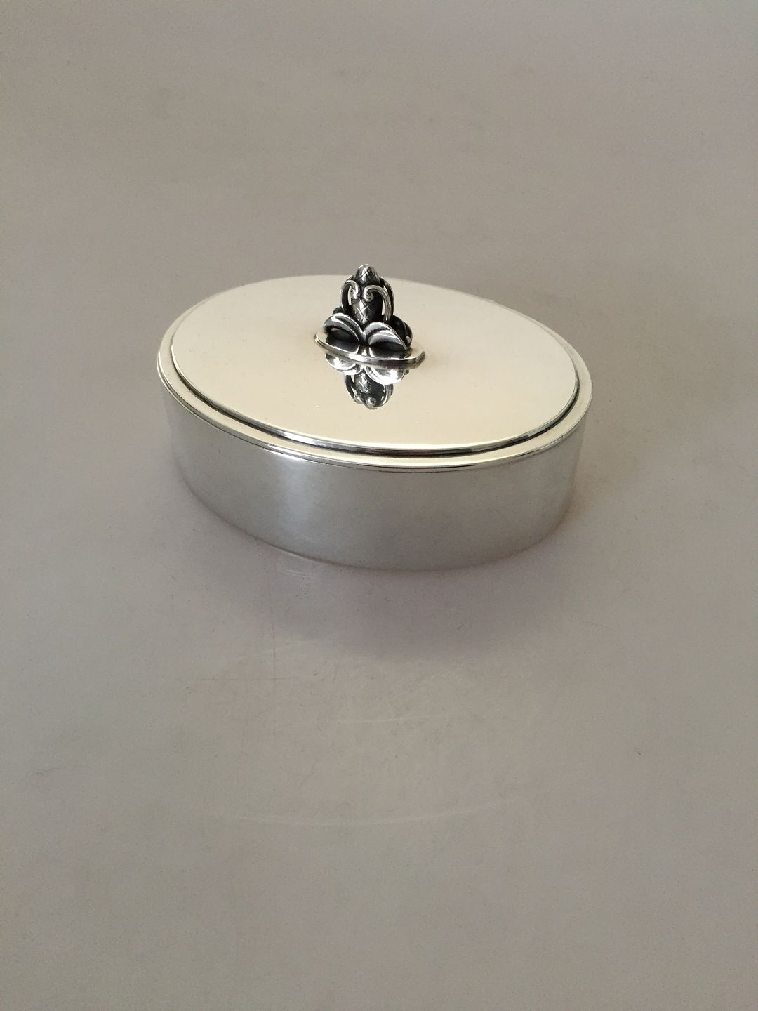 Georg Jensen Sterling Silver Oval box with mirror No 172. With post 1945 marks. Weighs 273 g / 9.65 oz. Measures 3.5 cm high, 12 cm long, 9 cm wide (1 8/3" x 4 23/32" x 3 35/64")