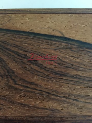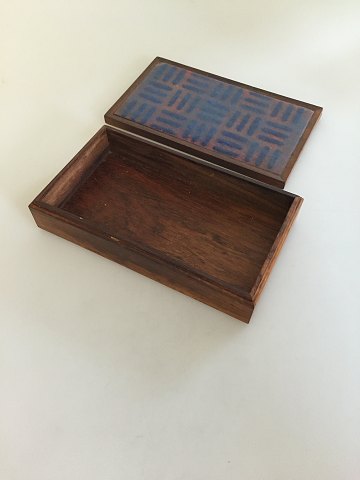 Wooden Palisander Box with Ceramic Enamel Lid in Shades of Blue. The ceramic lid has a small chip in one corner.