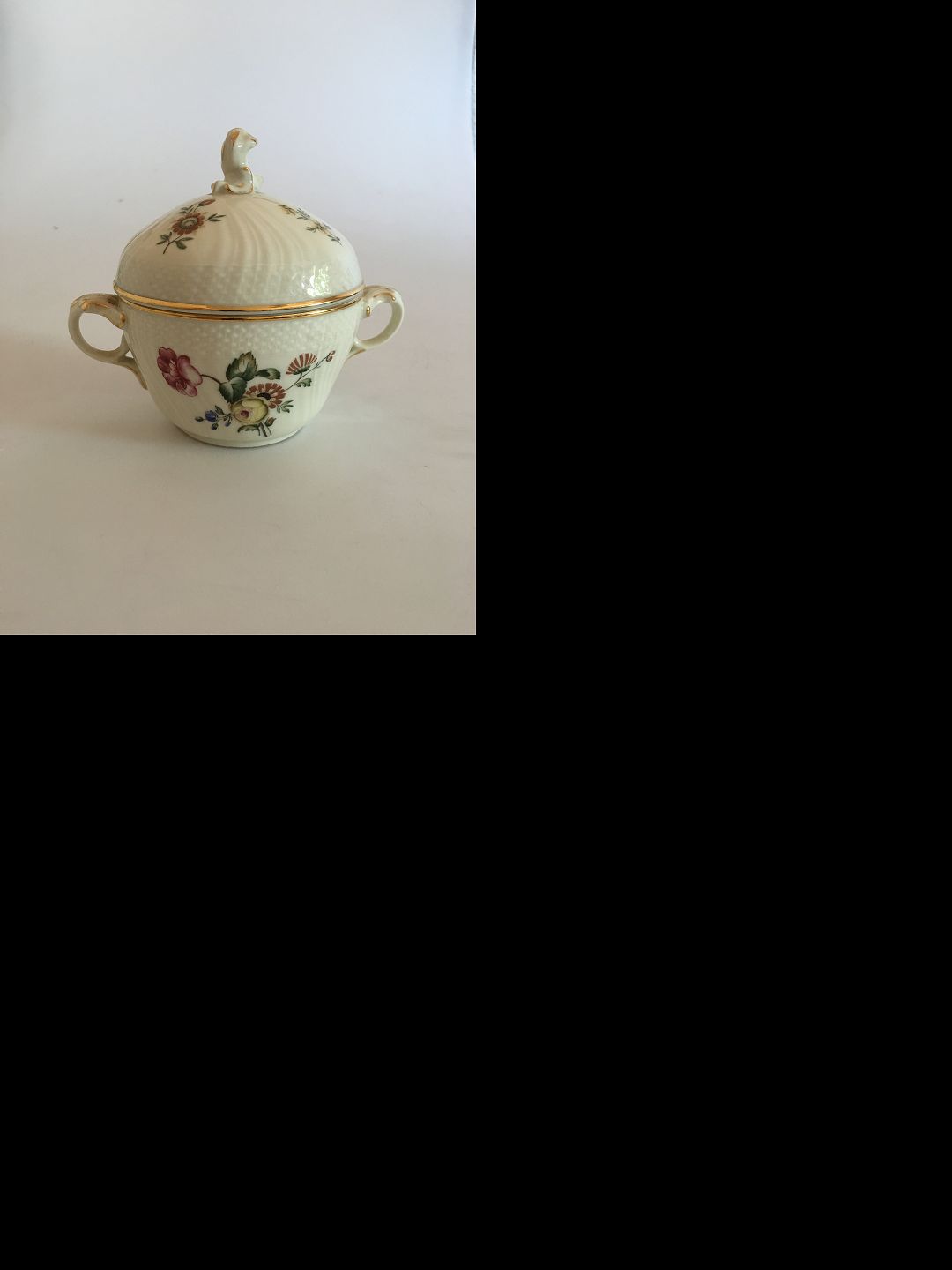 Royal Copenhagen Frijsenborg Large Sugar Bowl with Lid No 1865. Measures without lid 8 x 10.5 cm. Creme colored with flower motifs named after the Danish noble county of Frijsenborg.