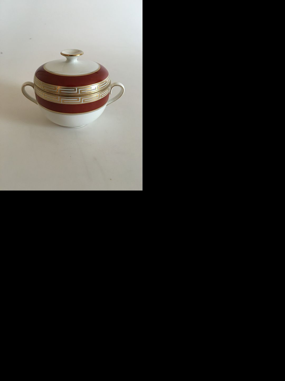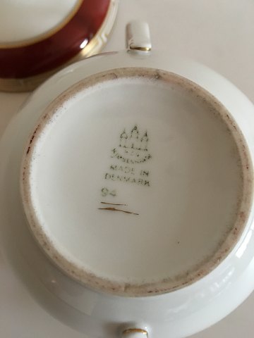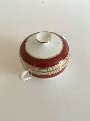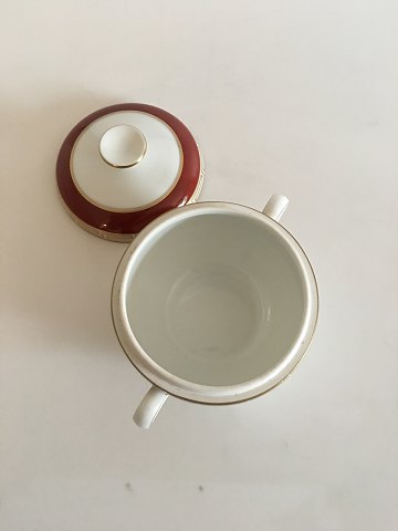 Bing & Grøndahl Wagner Sukkerskål No 94. Vinrød og Guld Bord. Måler 6.5 x 9.5 cm uden låg.