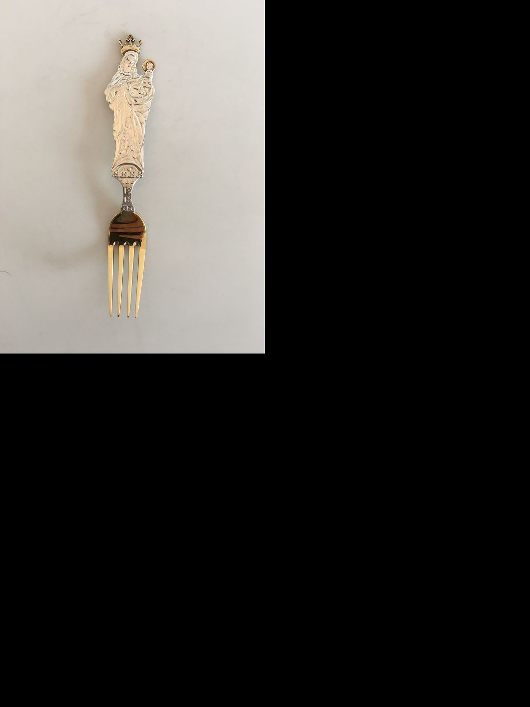 Anton Michelsen 1916 Christmas fork in gilded sterling silver. Marie Henriques designed the Christmas fork in 1916 with Madonna and Child as the motif. Marie Henriques traveled extensively in Europe and North Africa. German and Spanish wooden figures from the Middle Ages captivated her sense of form, as evidenced by the Gothic Madonna and Child.