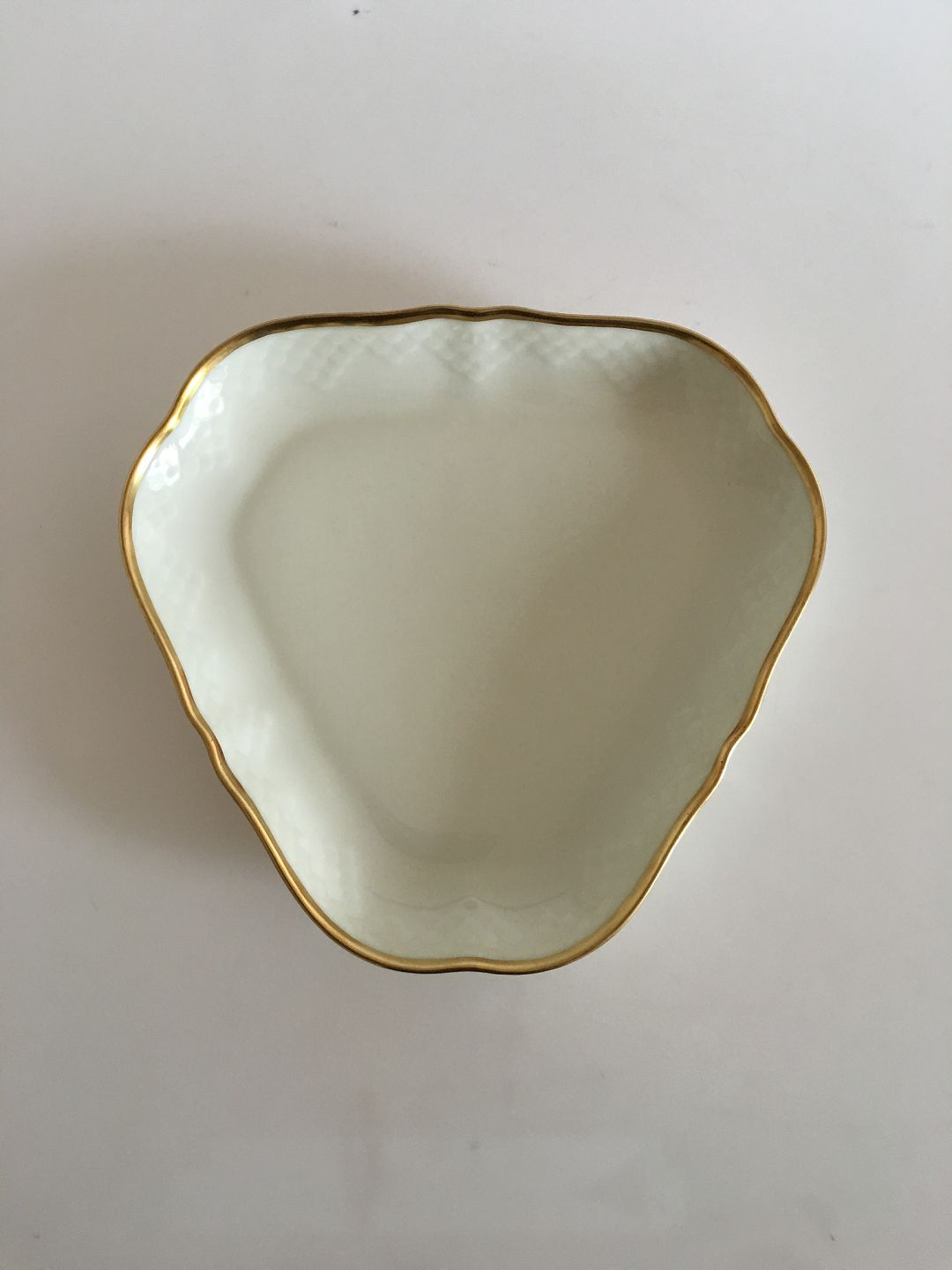 Bing & Grondahl Aakjaer Triangular Dish No 354. Creme with Gold Border. In good condition. 23 cm.