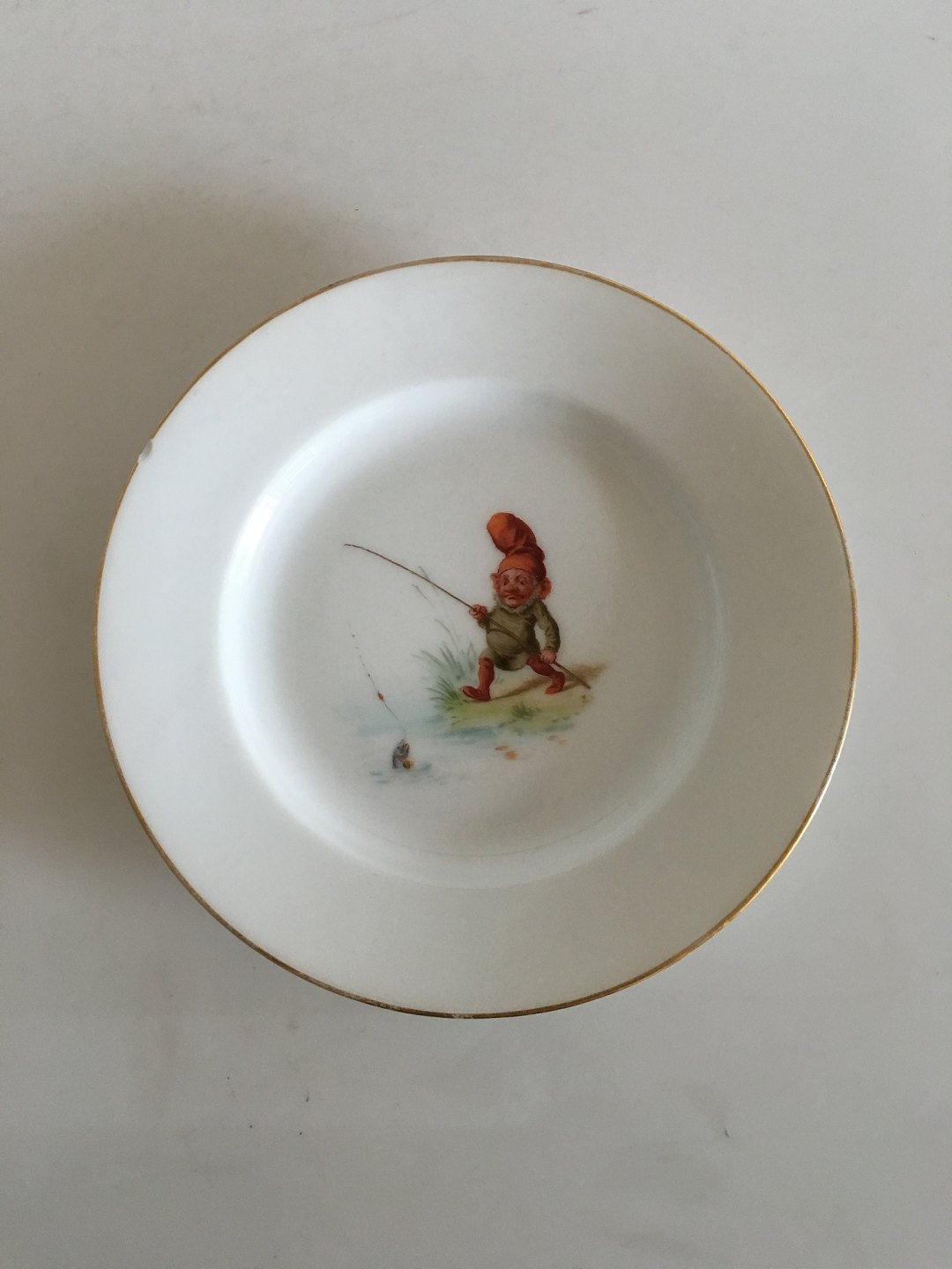 7 Plate 20.5 cm (8 5/64"). Gnome who has caught a fish. The gold on the border edge is relatively nice. The plate has one chip on the border edge.