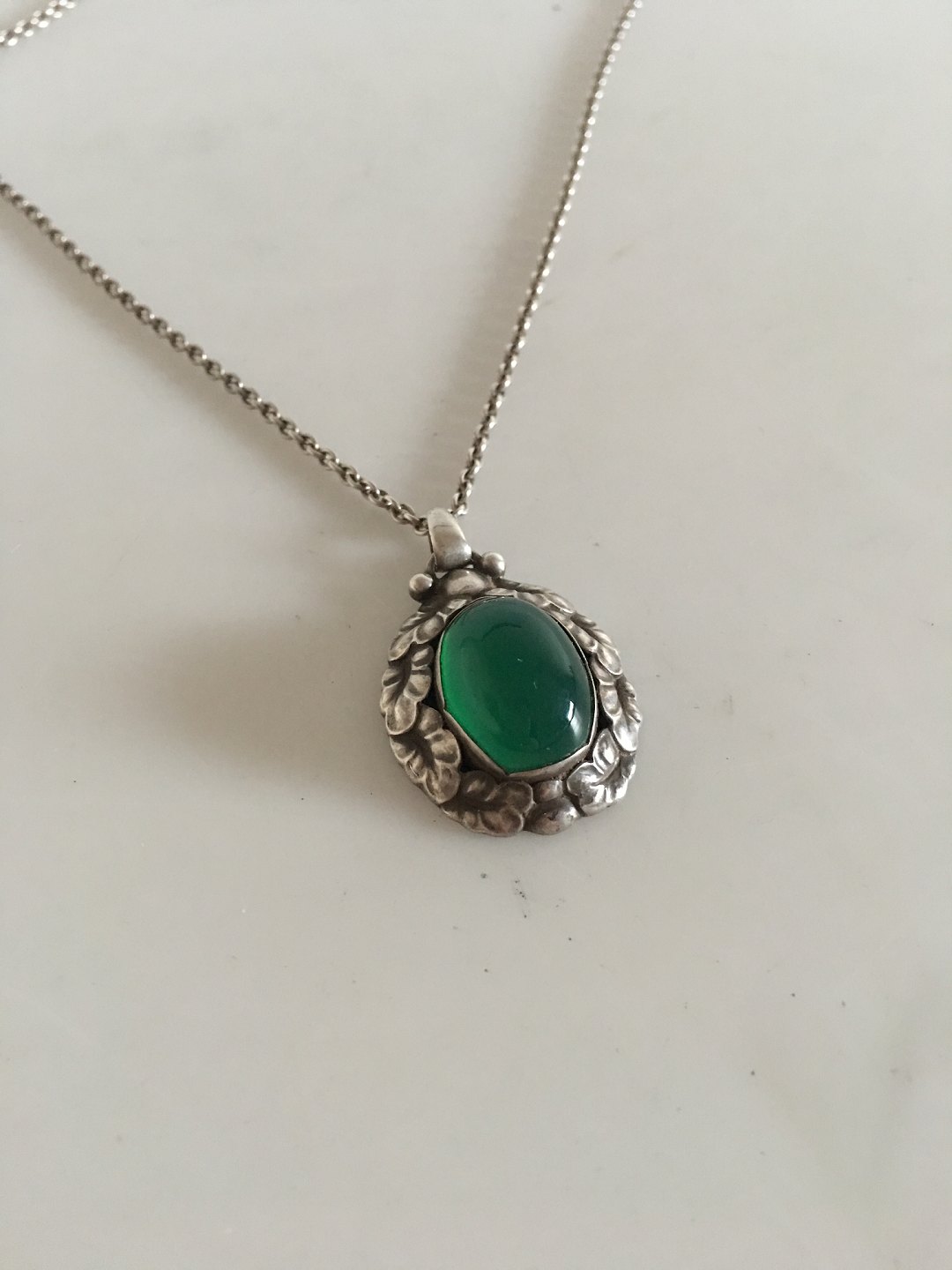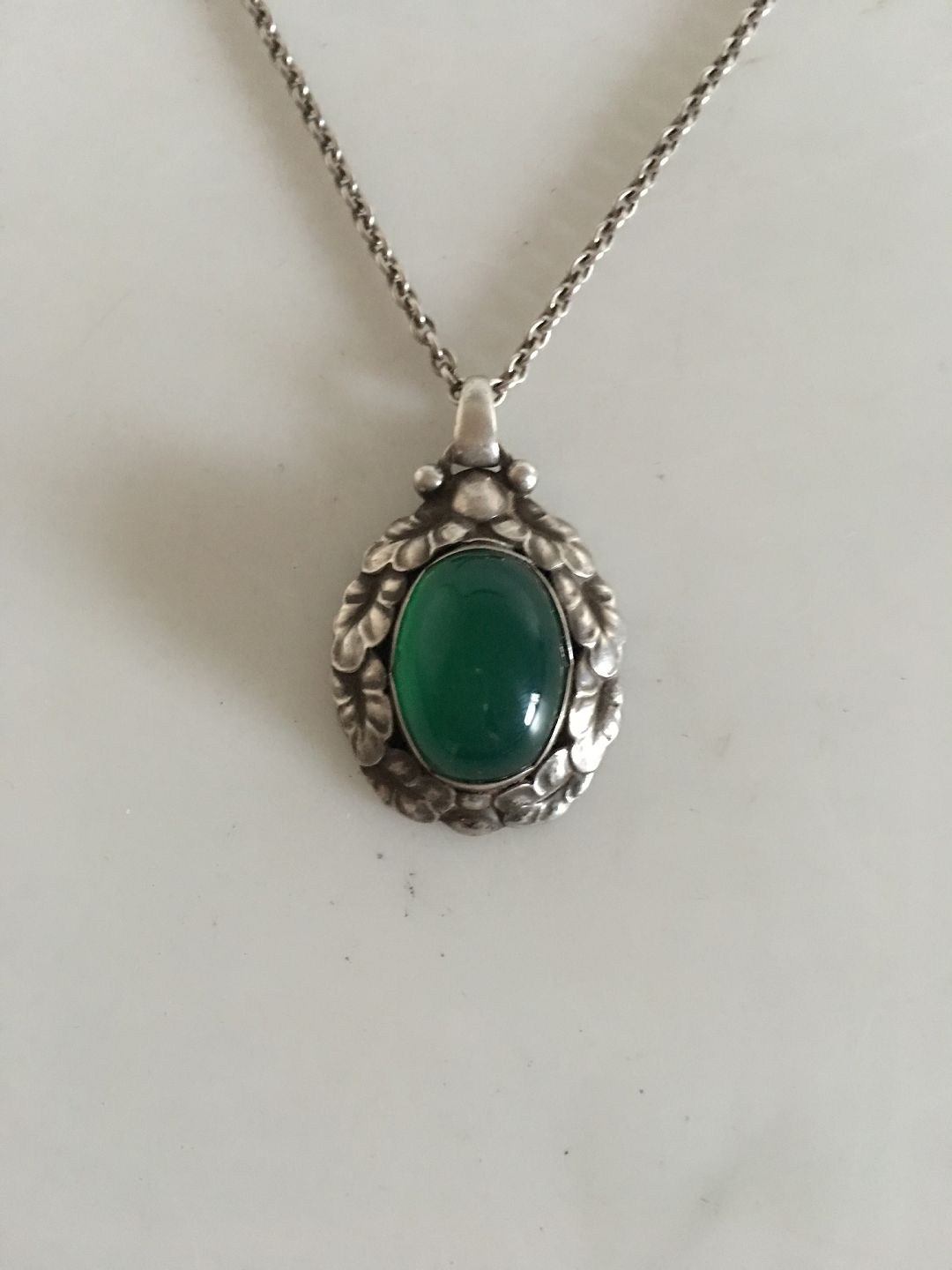 Georg Jensen Necklace with Sterling Silver Pendant No 56 with Green Agate. Chain measures 70 cm L (27 9/16"). Pendant measures 3 cm (1 3/16"). Combined weight of 16 grams (0.55 oz). From 1932-1945.