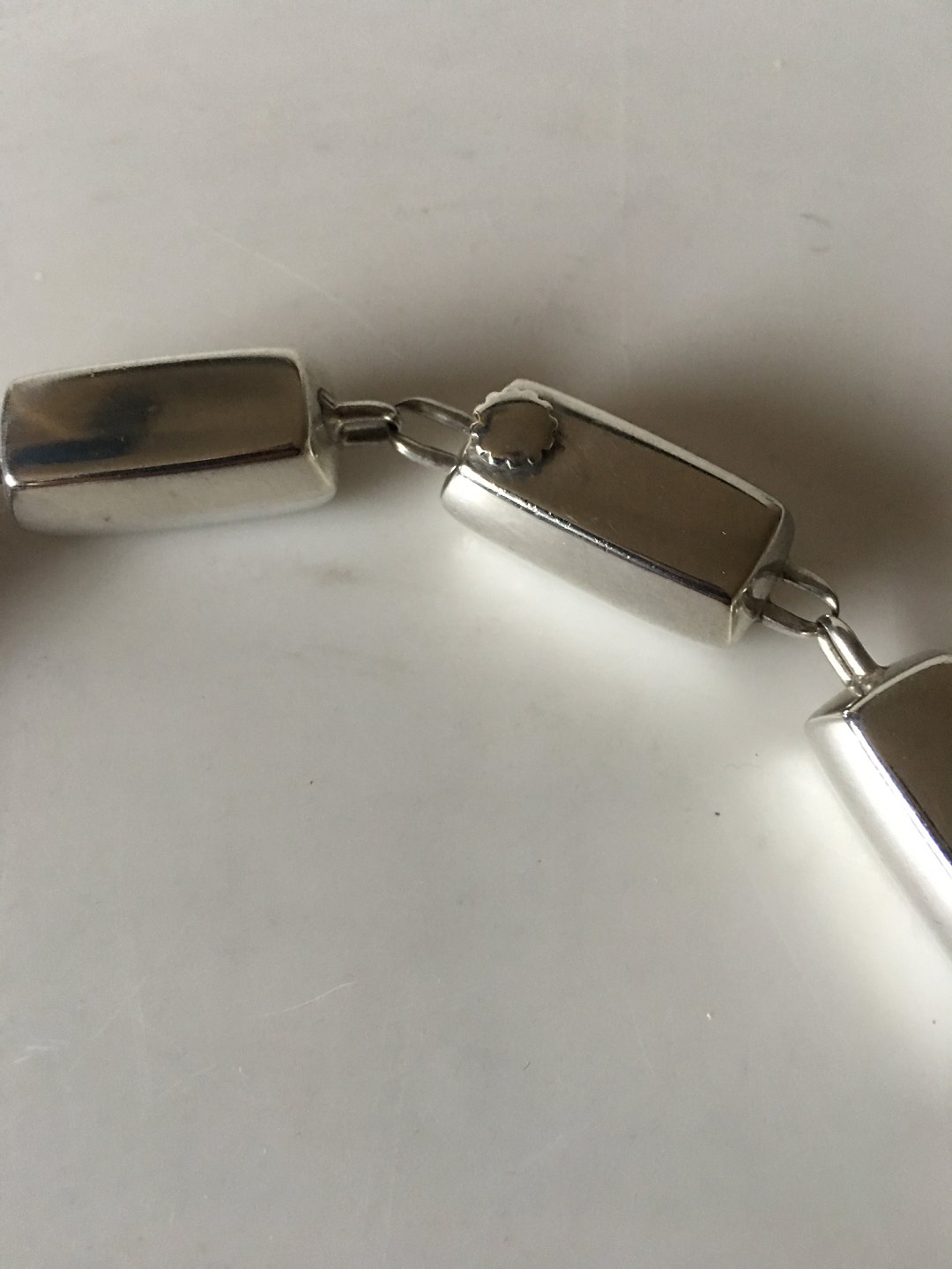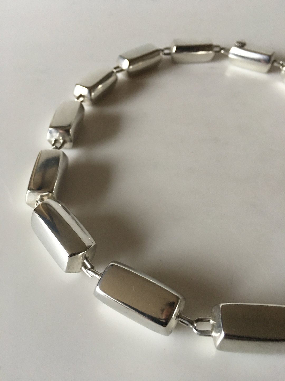 Hans Hansen Modern Sterling Silver Necklace. 52 cm L (20 15/32"). Weighs 115 grams (4 oz). In beautiful condition with only one bump in the silver "patron" link attached to the lock.