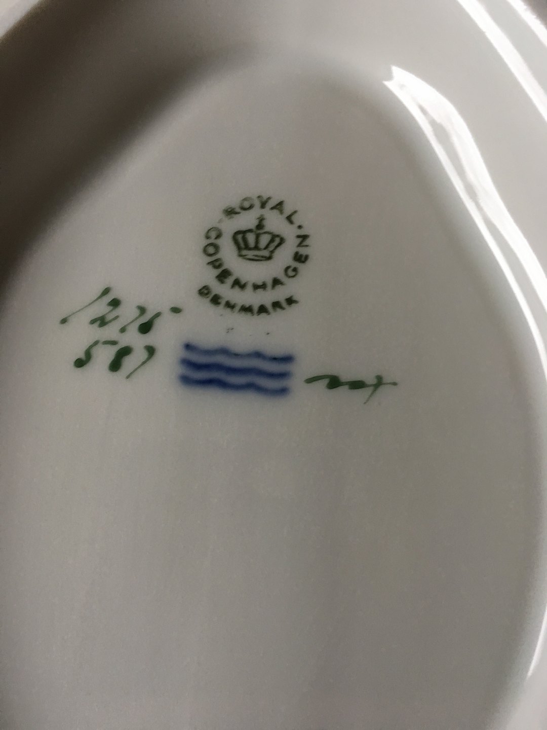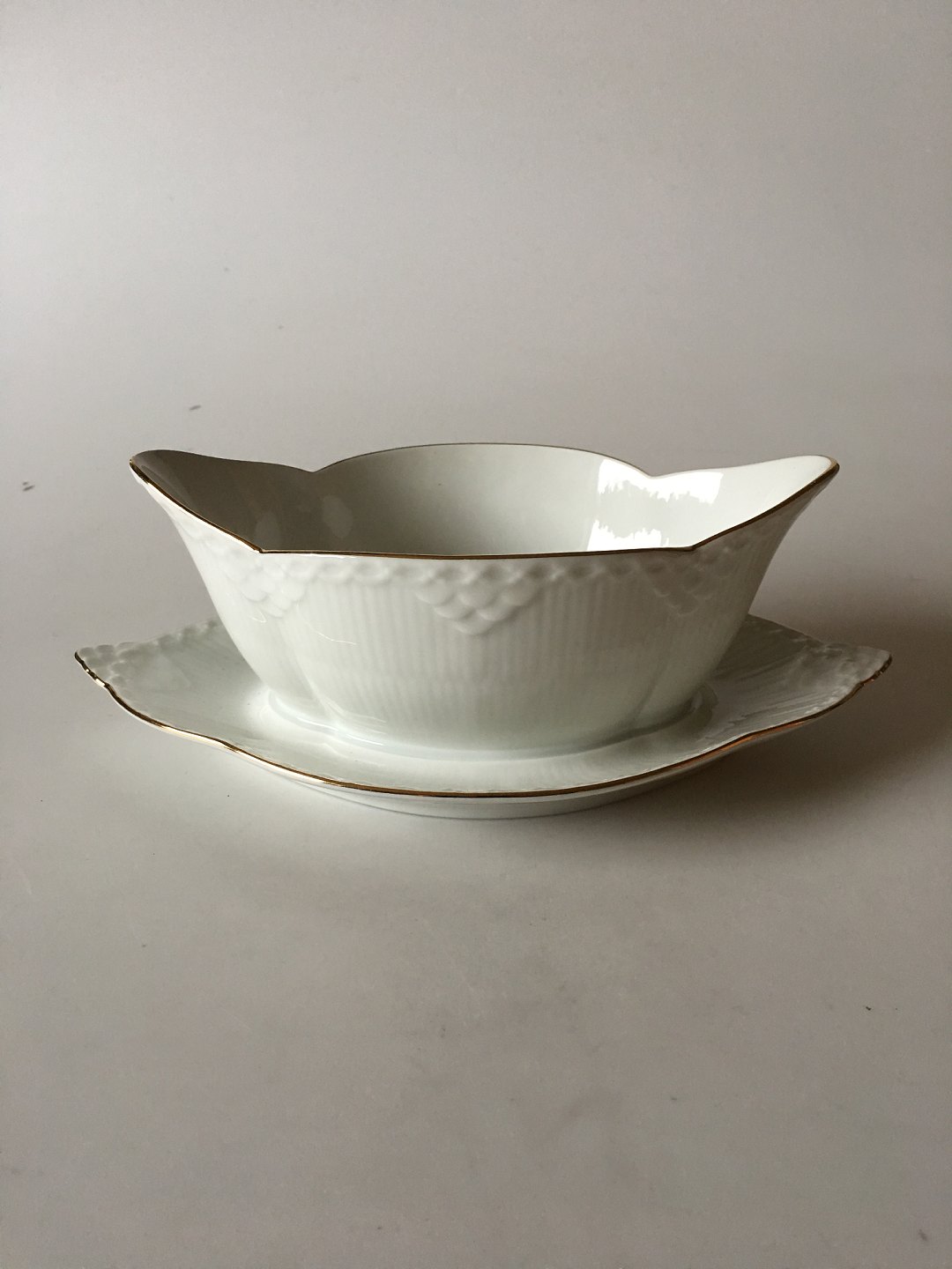 Royal Copenhagen Tradition White Half Lace w. Gold Sauce Bowl No 1275/587. The Sauce container itself measures 9 cm H (3 35/64") 19.5 cm L (7 43/64"). In perfect condition.