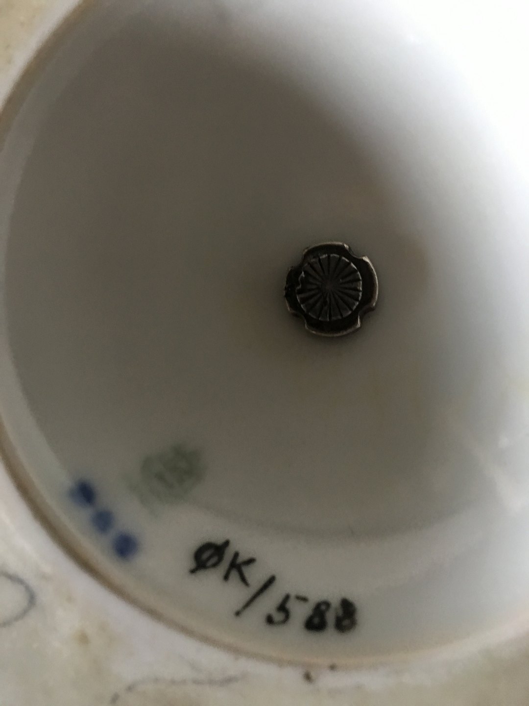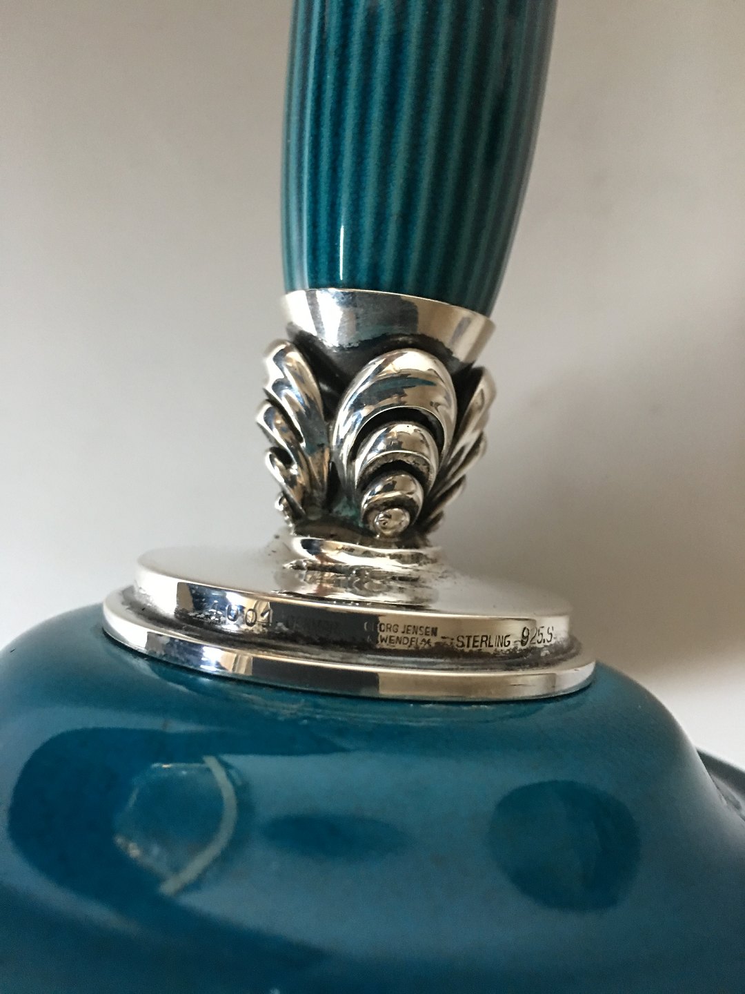 Georg Jensen Candlestick in Sterling Silver and Porcelain No 4001. Design by Harald Nielsen. Porcelain pieces by Bing & Grondahl. Marked Georg Jensen & Wendel. From 1945-1951. 29 cm H. (11 27/64")