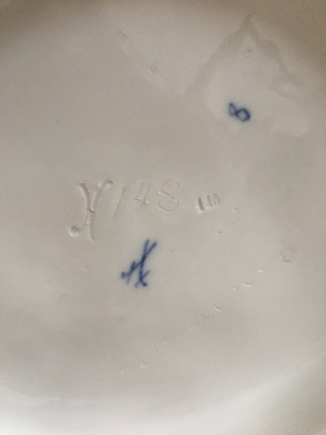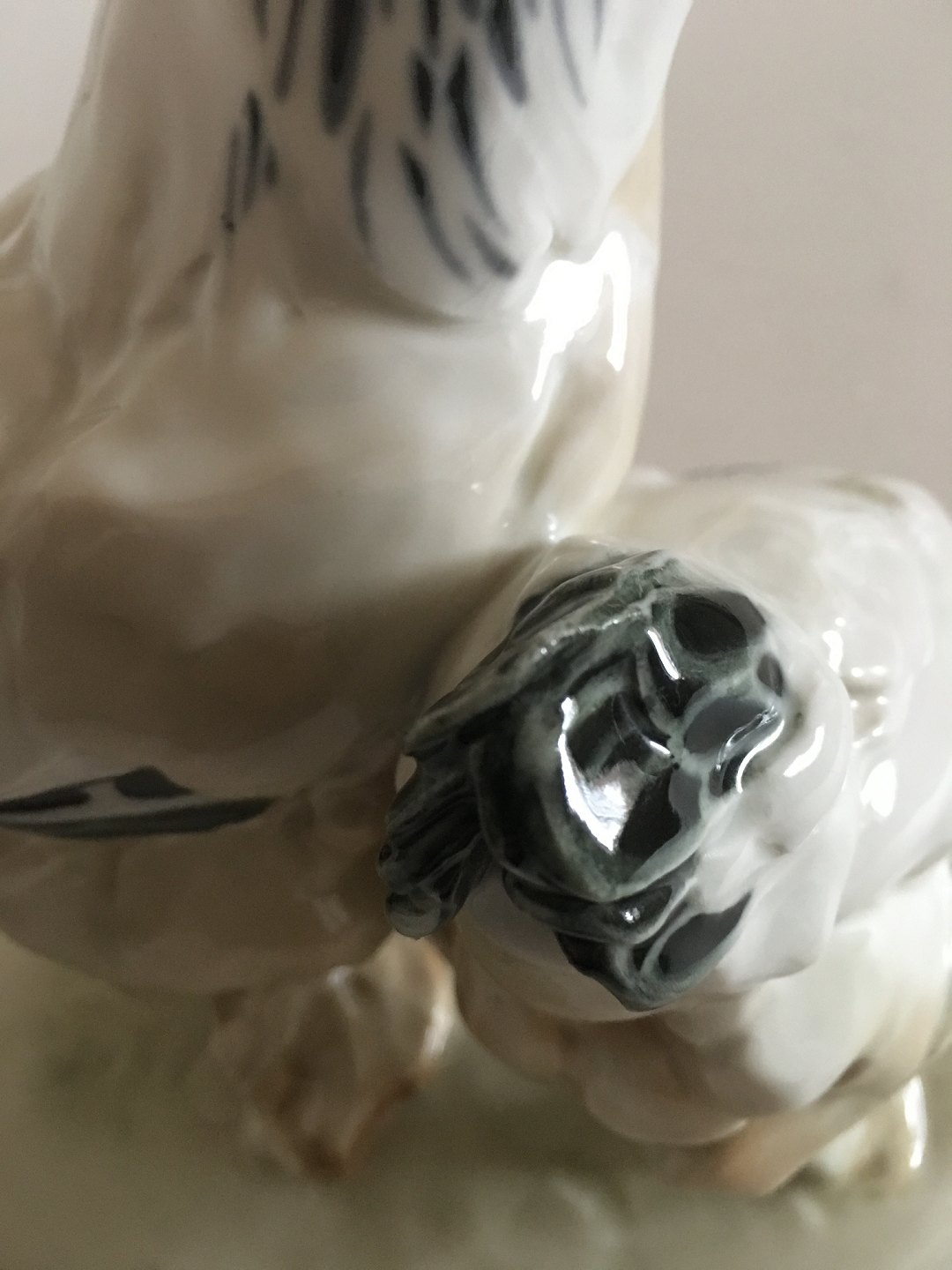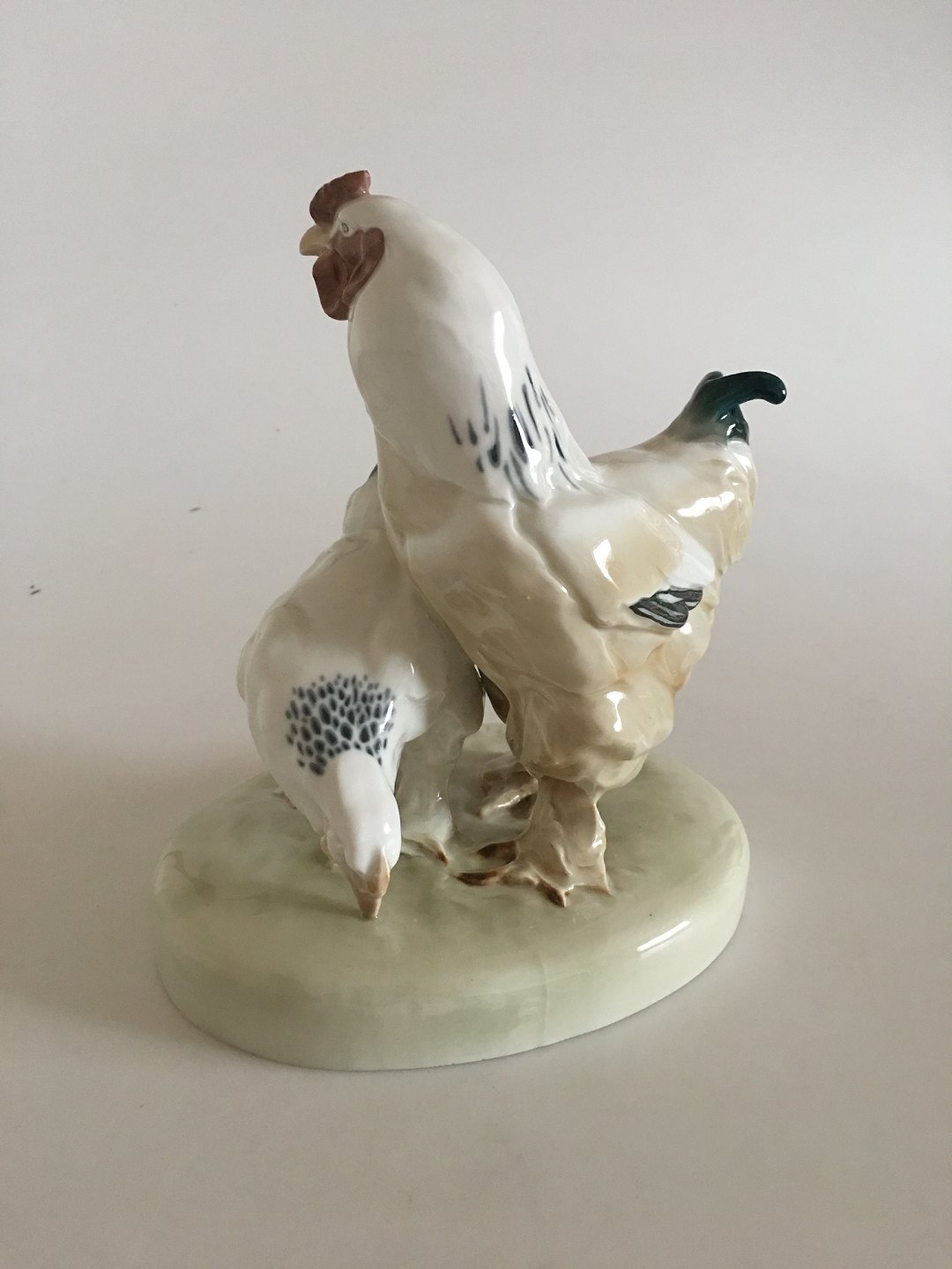 Meissen Figurine of Two Chickens. 22 cm H (8 21/32"). 18 cm dia (7 3/32"). The chicken in front of the rooster chicken has a minor reparation on its tale.