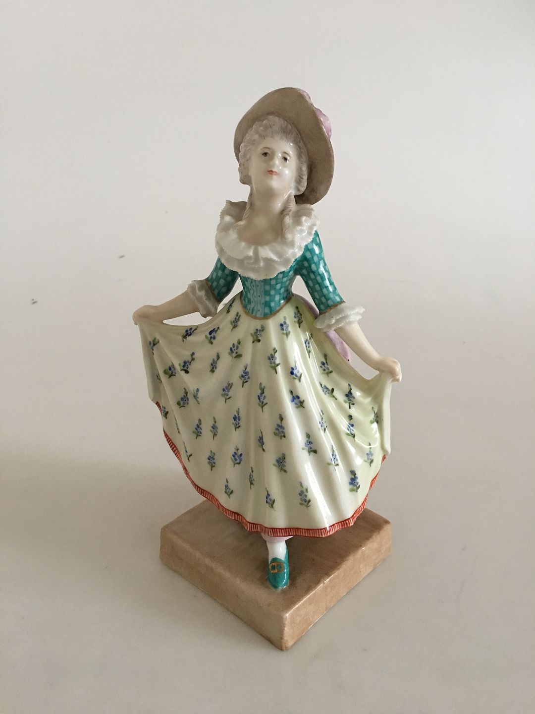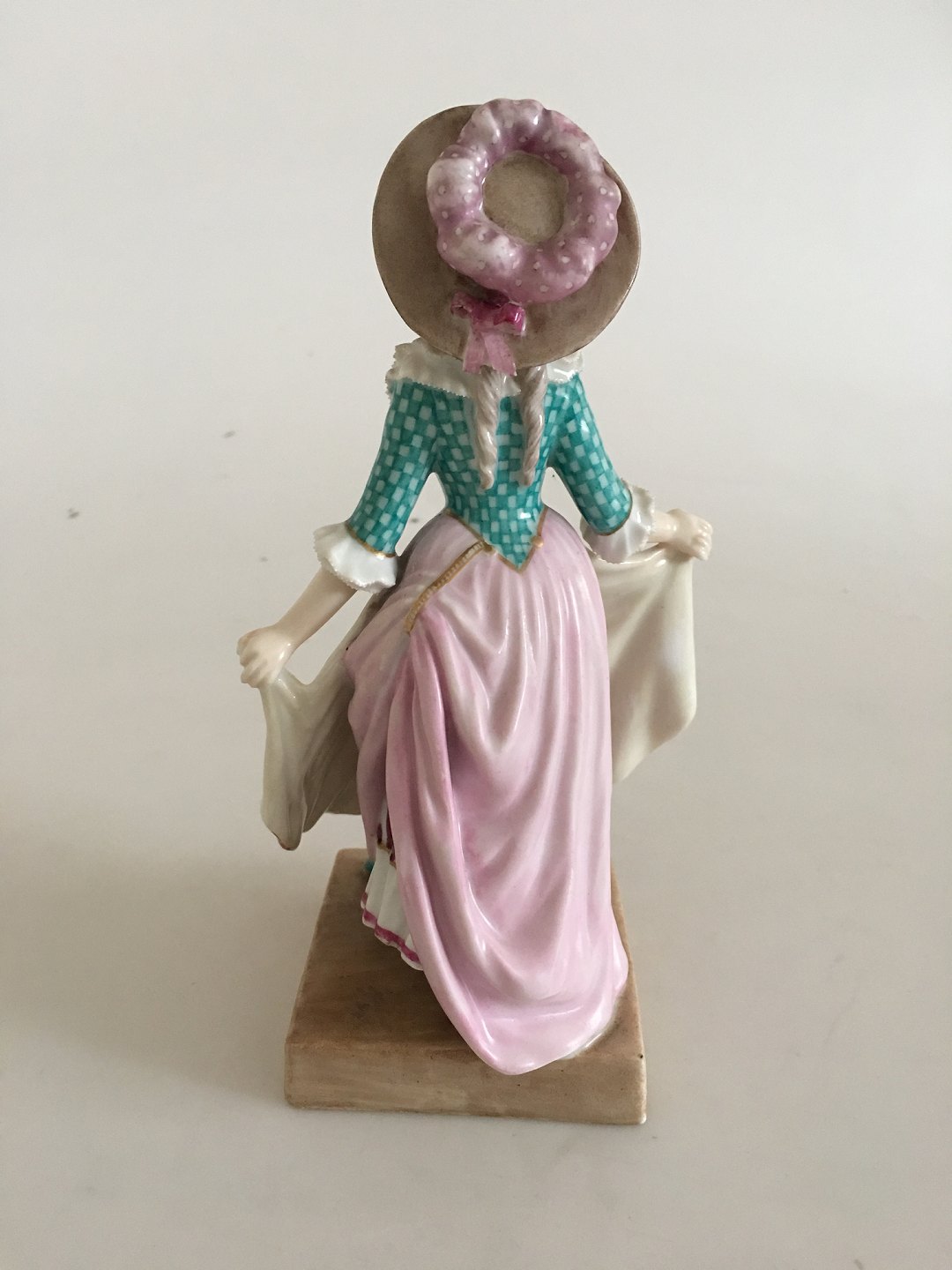 Royal Copenhagen Overglasur Figurine af Bondepige i Rokoko Stil. I fin stand med undtagelse af et afslag på hattens sløjfe. Med gammelt bølge stempel. 20 cm Høj.