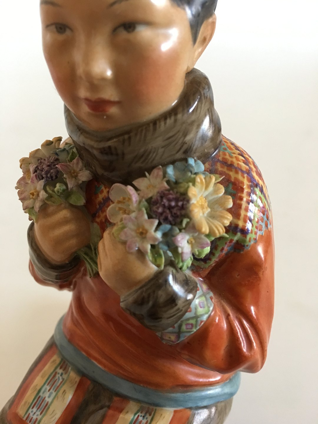 Royal Copenhagen Overglasur Figur Grønlandsk Pige No 12415. Måler 15cm og er i god stand, men har lille afslag på blomst. Designet af Carl Martin-Hansen.