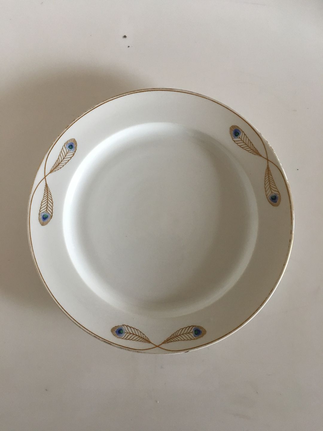 Royal Copenhagen No 118 Round Serving Tray w. Golden Peacock Feather Ornament. 32.5 cm dia (12 51/64") Has a chip underneath (look to picture). The gold has some wear to it. Antique, Rare Royal Copenhagen Dinner Service Pattern