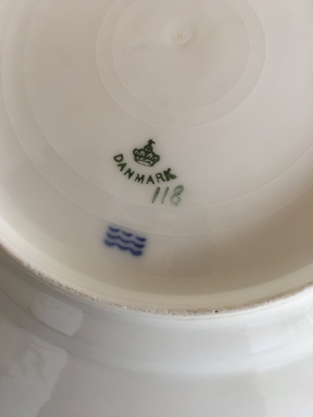 Royal Copenhagen No 118 Side Dish w. Golden Peacock Feather Ornament. 15 cm dia (5 29/32"). In whole condition, but the gold along the edges has some wear to it. Antique, Rare Dinner Service Pattern from Royal Copenhagen