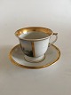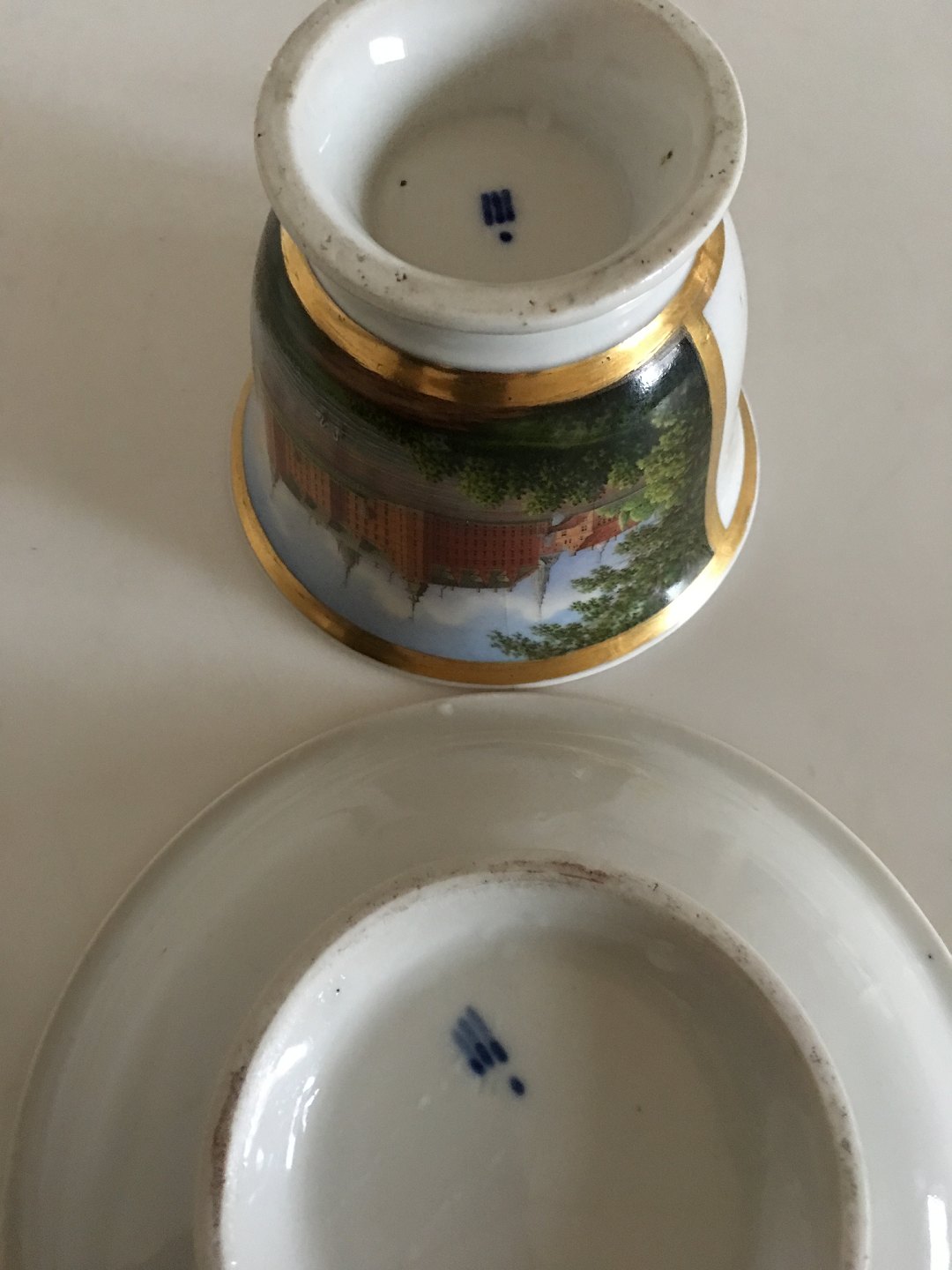 Royal Copenhagen Antique Morning Cup and Saucer with Handpainted Motif of Frederiksborg Castle. The motif is intact and the gold looks nice with only some minor wear. The handle has a reparation and a hairline. The cup is 9 cm H (3 35/64") 11.5 cm dia (4 17/32").