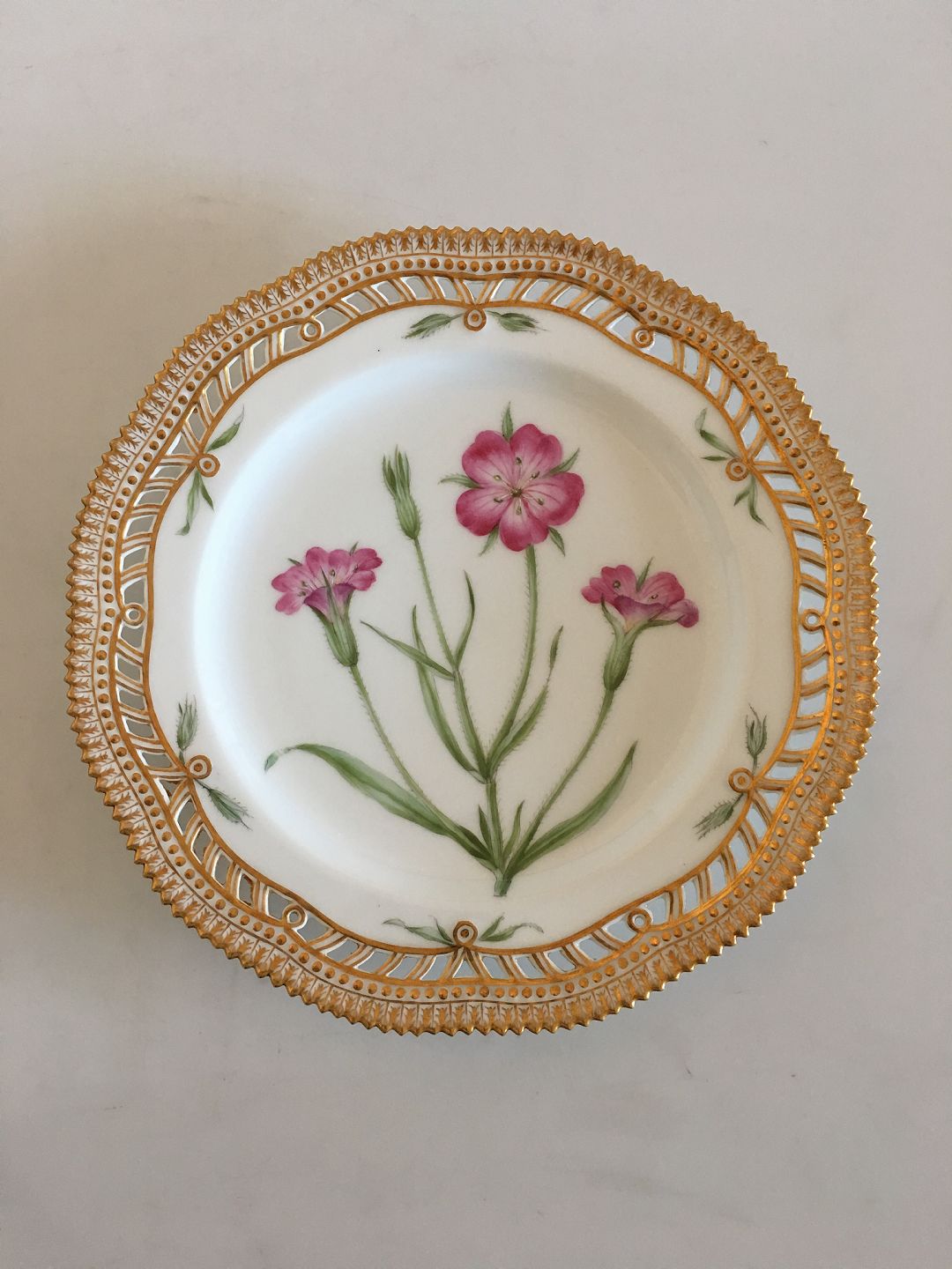 Royal Copenhagen Flora Danica Luncheon Plate No 3554 with Pierced Border. 22.5 cm dia (8 55/64"). Latin Name: Agrostemma Githago. From 1894-1900