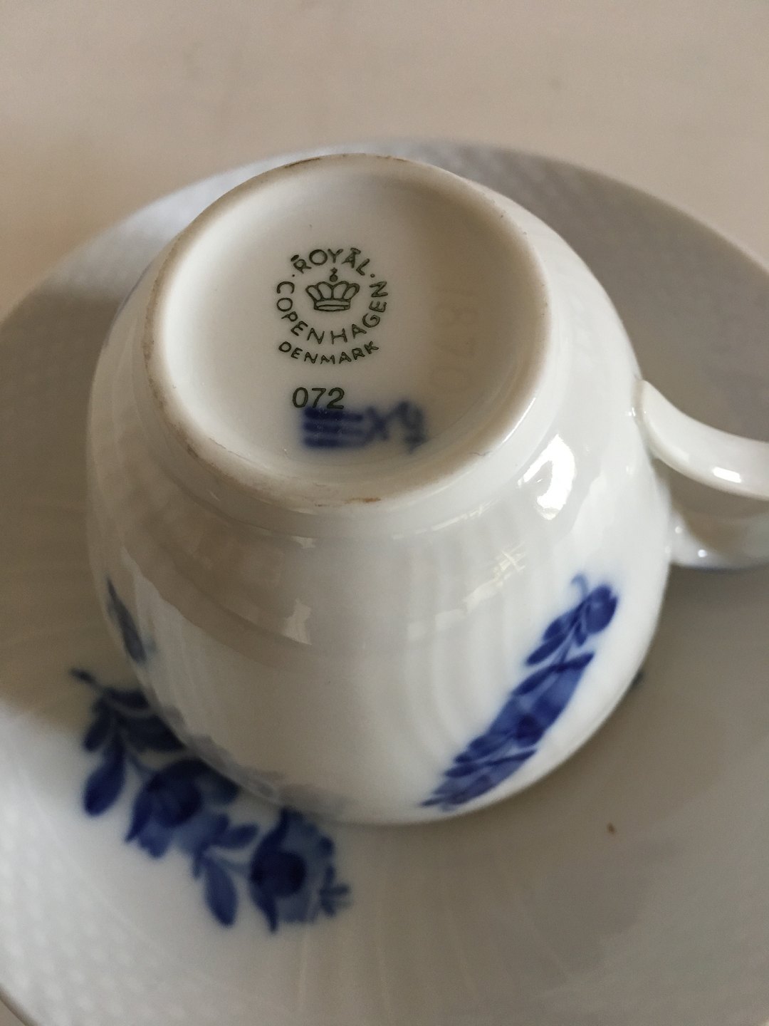 Royal Copenhagen Blue Flower Curved Coffee Cup with Saucer No 072. The cup measures 6 cm H. 7.5 cm dia. The saucer measures 14 cm dia. In nice condition.