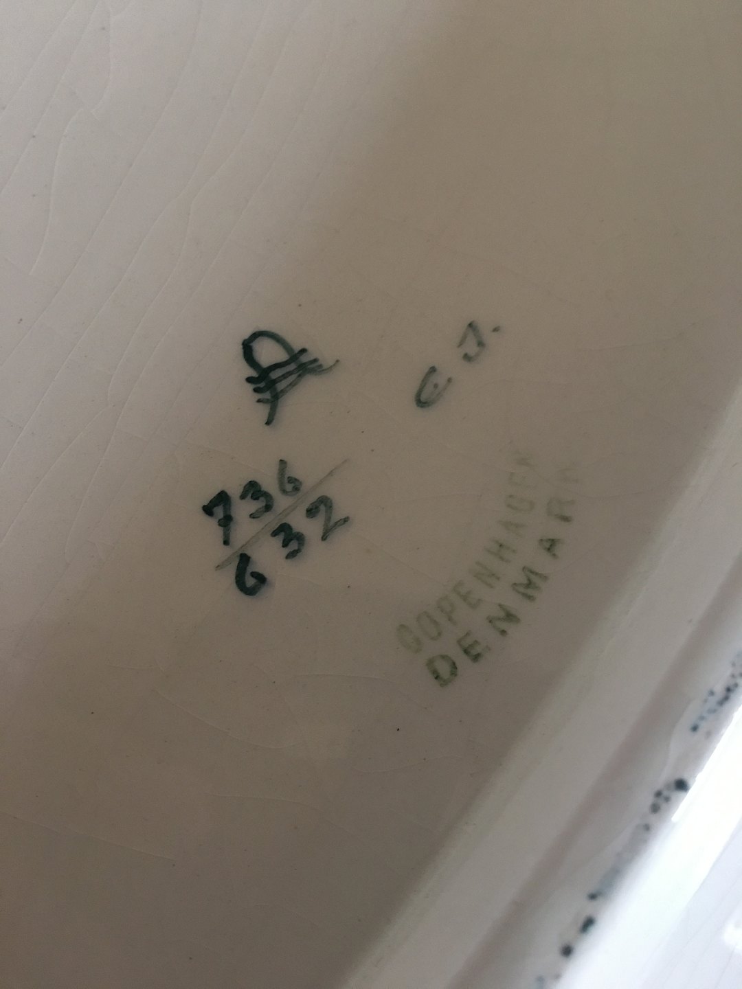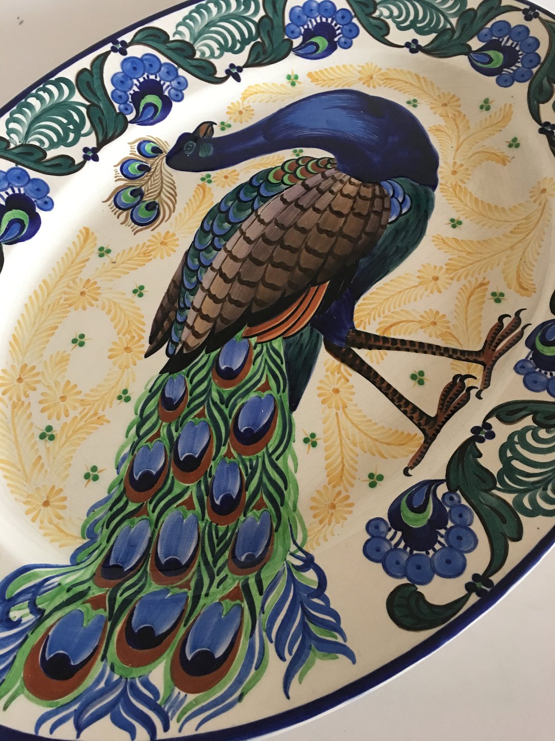 Aluminia Ovalt Fajance Fad med Påfugle Motiv No 736/632. Måler 62 x 45 cm. I fin stand uden skår eller reparationer.
