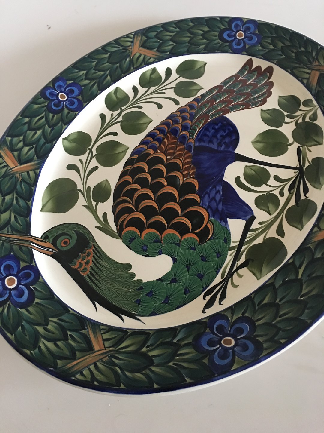 Aluminia Ovalt Fajance Fad No XIX med Påfugle Motiv Signeret. EN.M . Måler 52.5 x 42 cm. I flot stand uden skår, reparationer el. lignende.