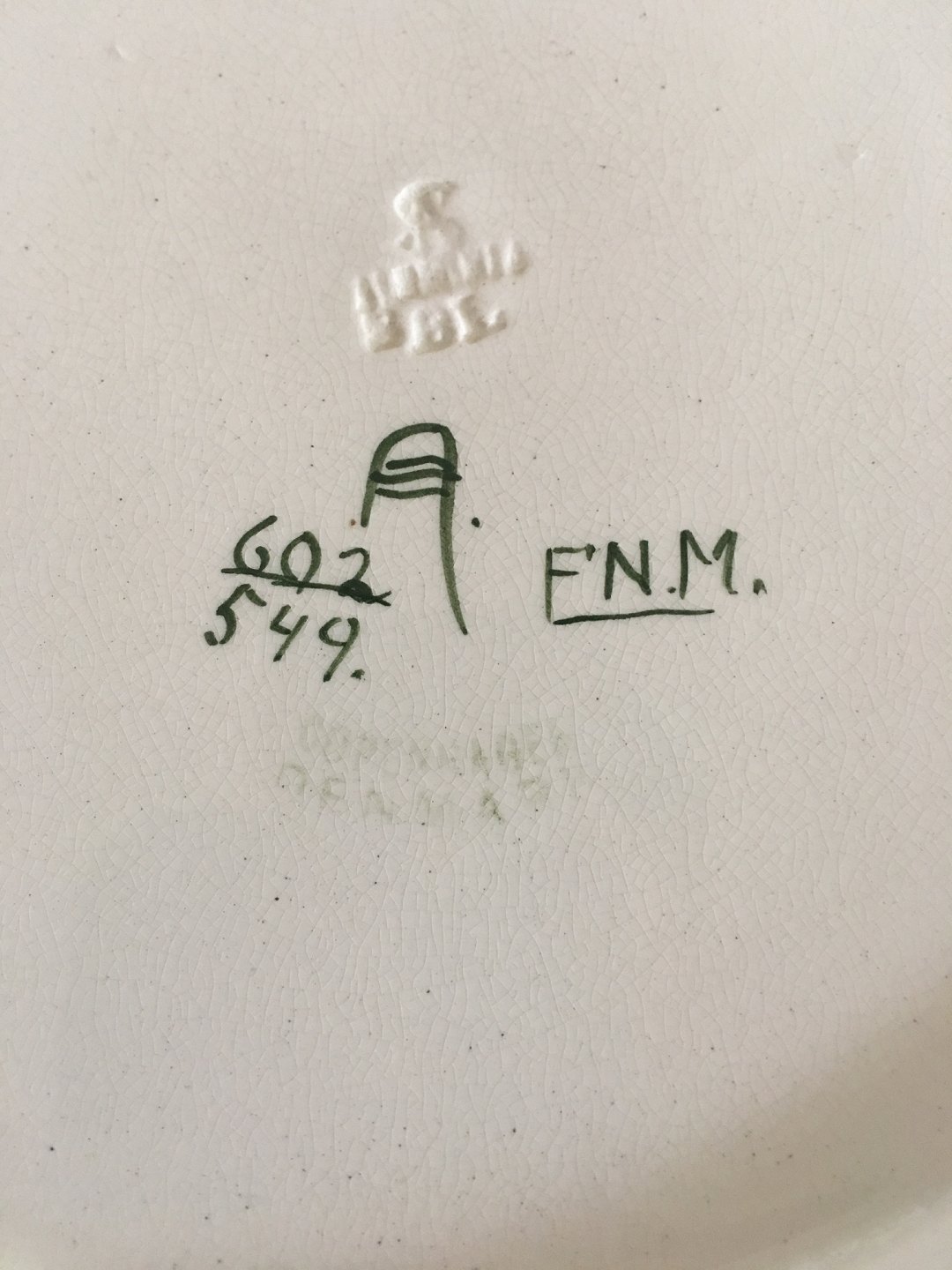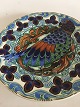 Aluminia Earthenware Round Bowl Dish No 602/549 with Bird Motif of parrot. Signed F.N.M. In great condition, without any chips, reparation etc. Measures 41 cm dia (16 9/64")