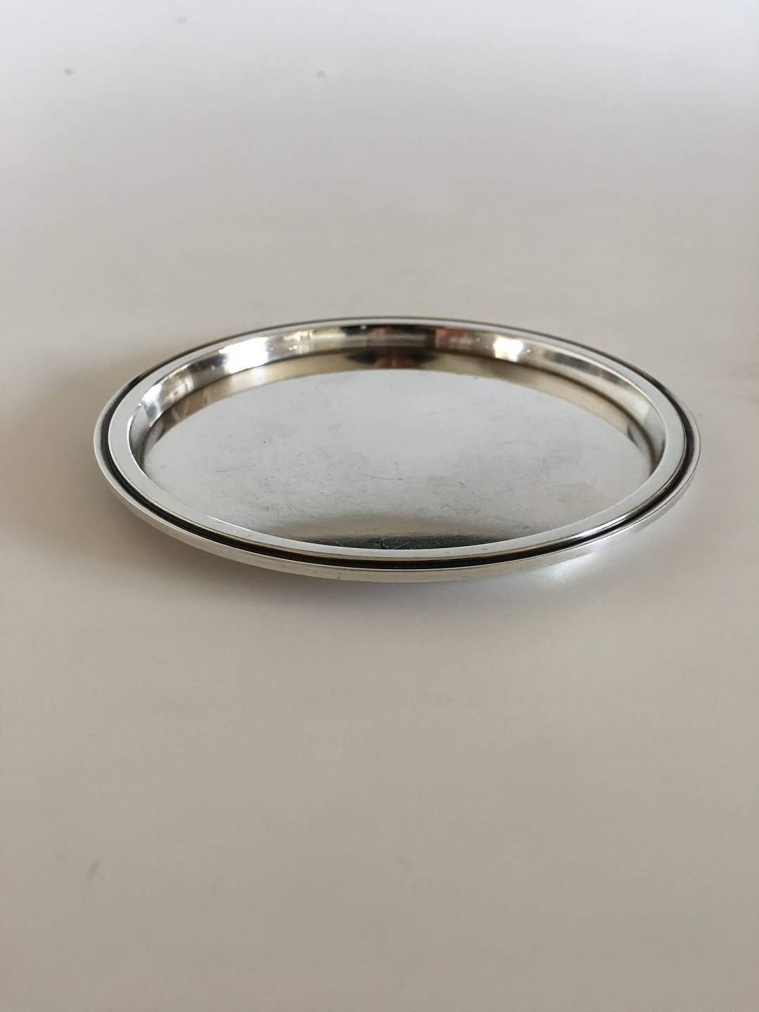 Georg Jensen Sterling Sølv Pyramide Flaske Bakke No 600B. Designet af Harald Nielsen. 12.5 cm Ø. 0.6 cm H. Vejer 102 gram. I pæn stand med lidt brugsspor. Fra efter 1945.
