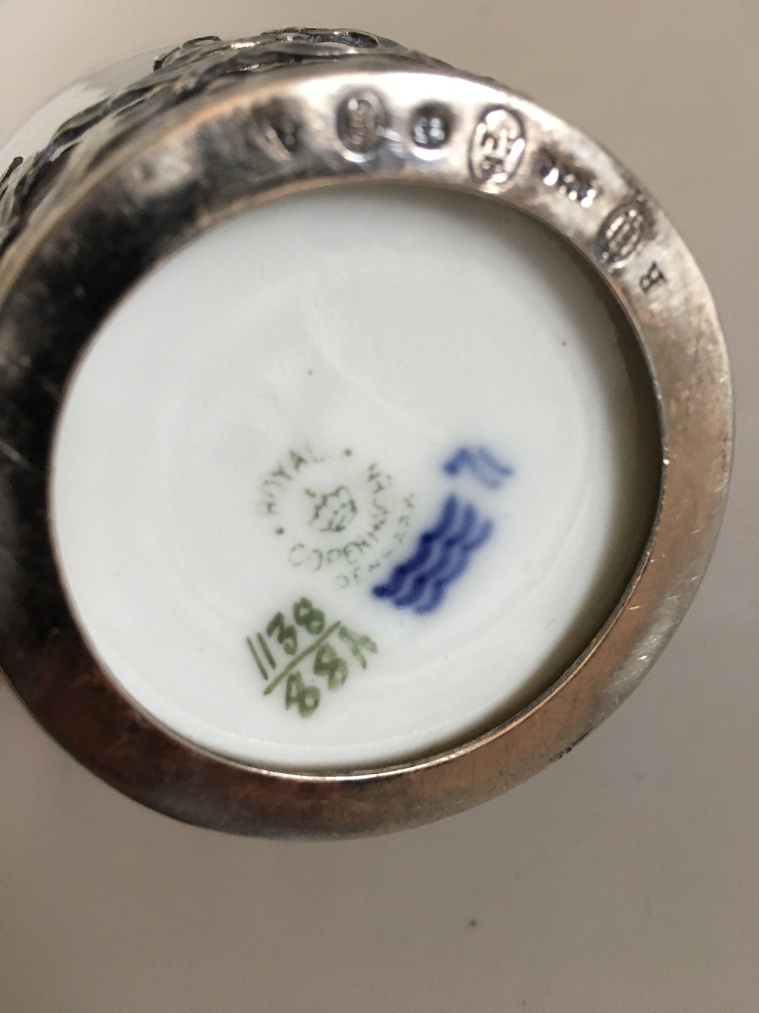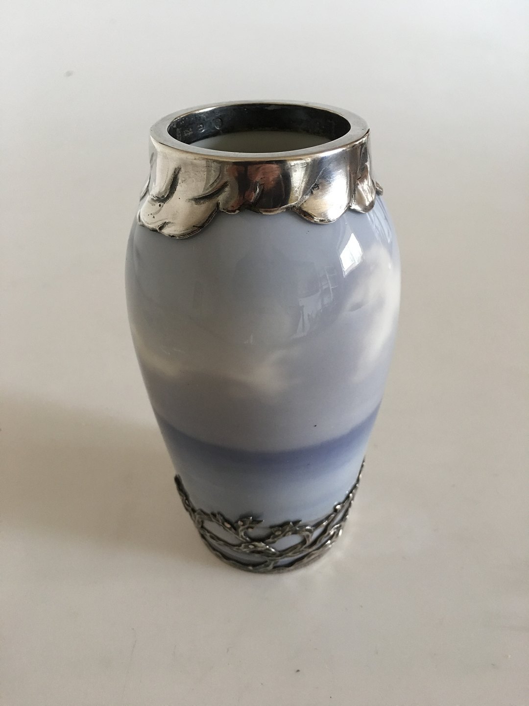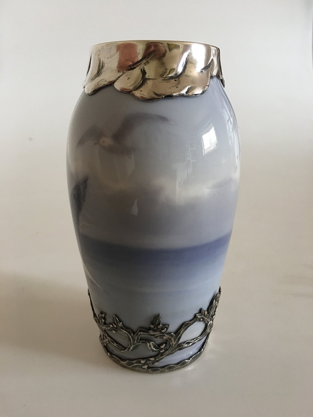 Royal Copenhagen Art Nouveau Vase No. 1138/88A Med Måge og Havmotiv og Anton Michelsen Sterling Sølv Monteringer. 14 cm Høj. 1. Sortering. I fin hel stand.