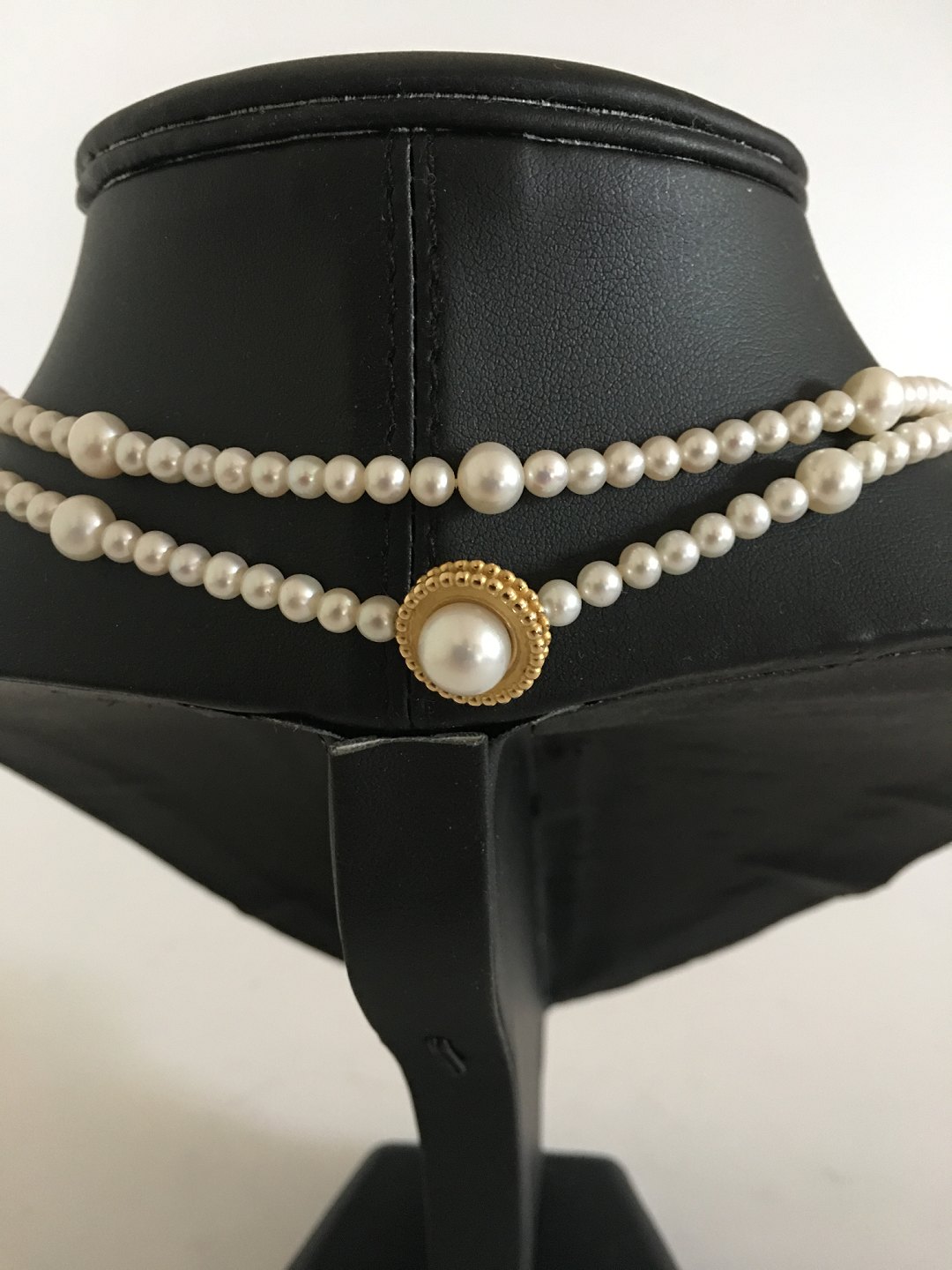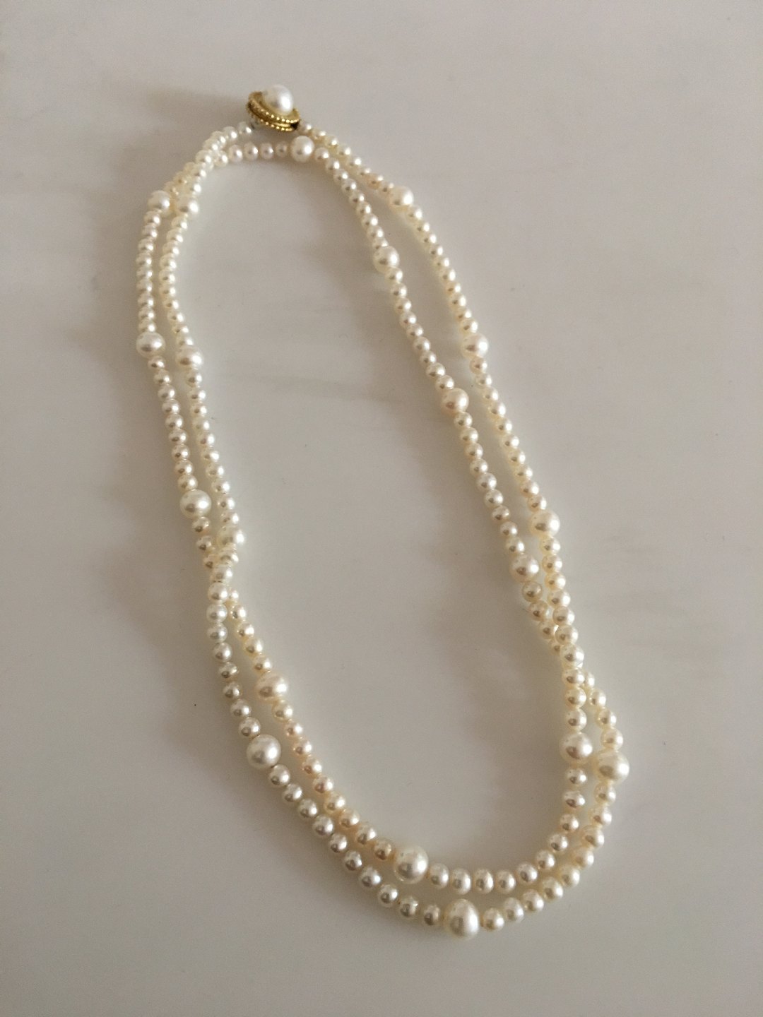 Georg Jensen Collier with White Freshwater Cultured Pearls and Gold Lock. 88 cm L (34 41/64"). Round pearls in beautiful condition. A collier offers several styling options. The Pearl Are 4 mm and the large ones Are 7mm