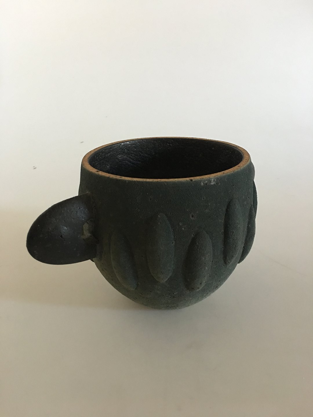 Royal Copenhagen Unique Modern Stoneware Vase by Pia Langelund. Two handles vase with a nice rough moss looking texture. The vase is 12.5 cm H (4 59/64"). 13 cm dia (5 1/8")