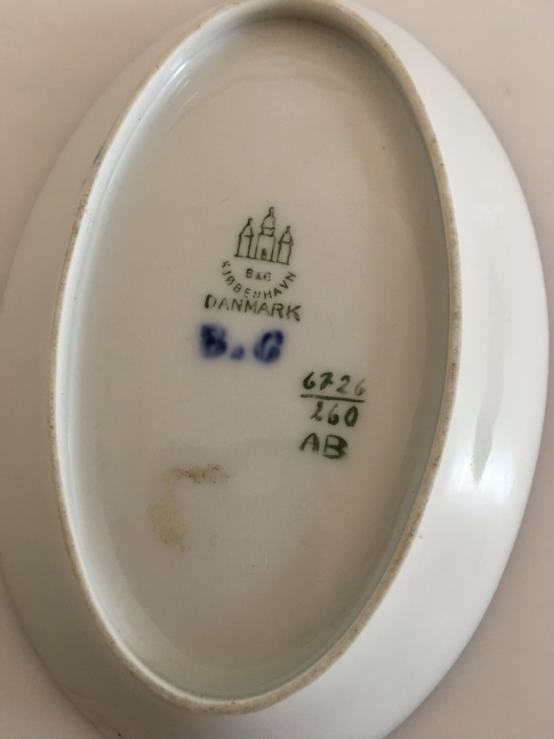 Bing & Grøndahl Lille Oval Skål med Blomstermotiv No. 6726/260. 13.5 x 9.2 cm. 1. Sortering fra 1915-1947. I pæn hel stand.