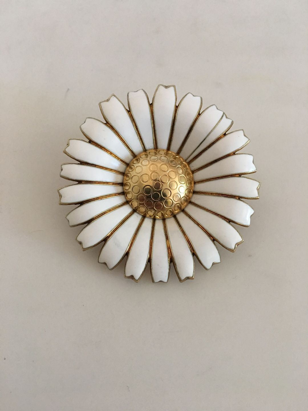 Anton Michelsen Daisy Brooch in Gilded Sterling Silver and White Enamel. Measures 5 cm / 1 31/32". Weighs 31.2 g / 1.10 oz. In nice condition