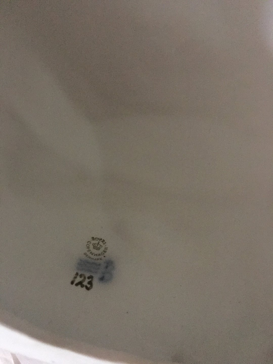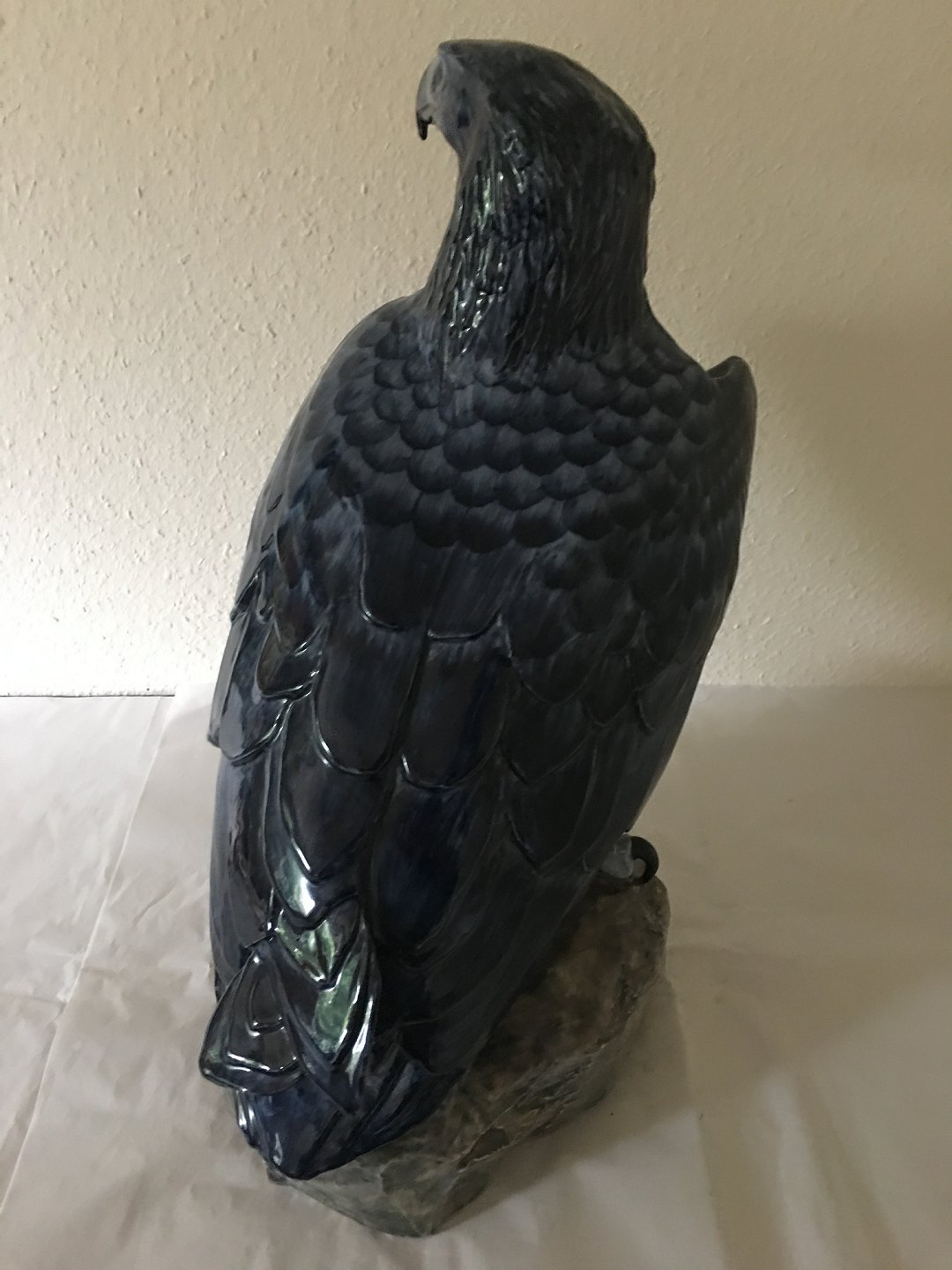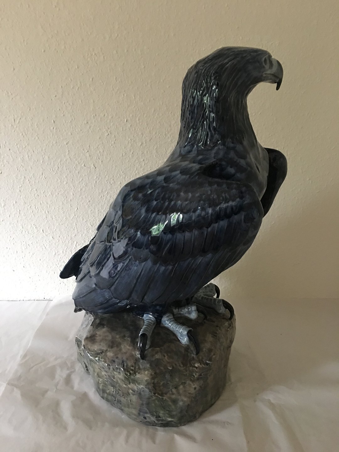 Royal Copenhagen Blå Ørn Vilhelm Th. Fischer 1857-1928. Figur af porcelæn i form af ørn siddende på klippestykke. Fremstillet hos Royal Copenhagen, dessin 123. Sign. Vilhelm Th. Fischer 1919. H. 54 cm. Mærket som 1st sortering og i perfect stand.