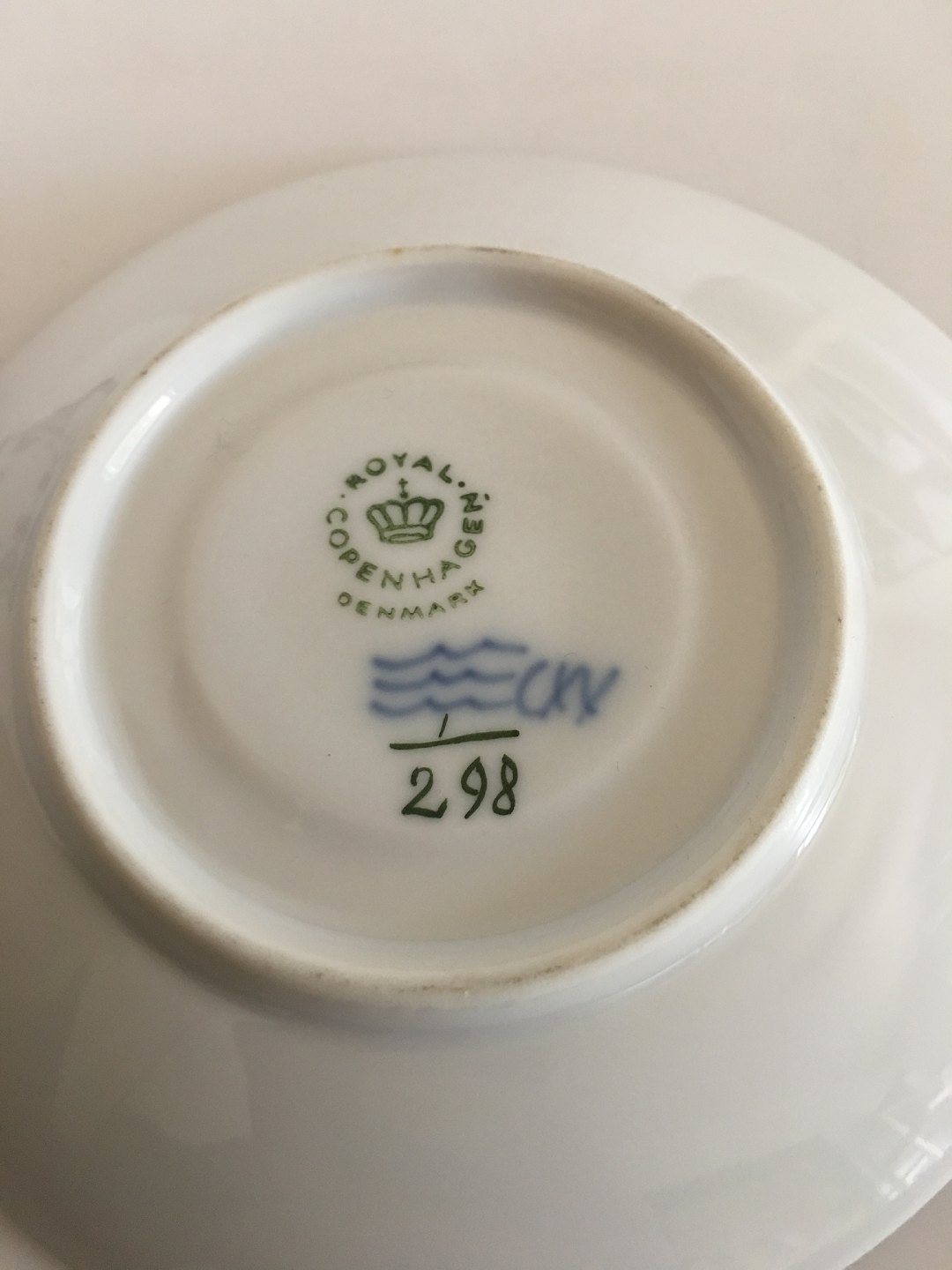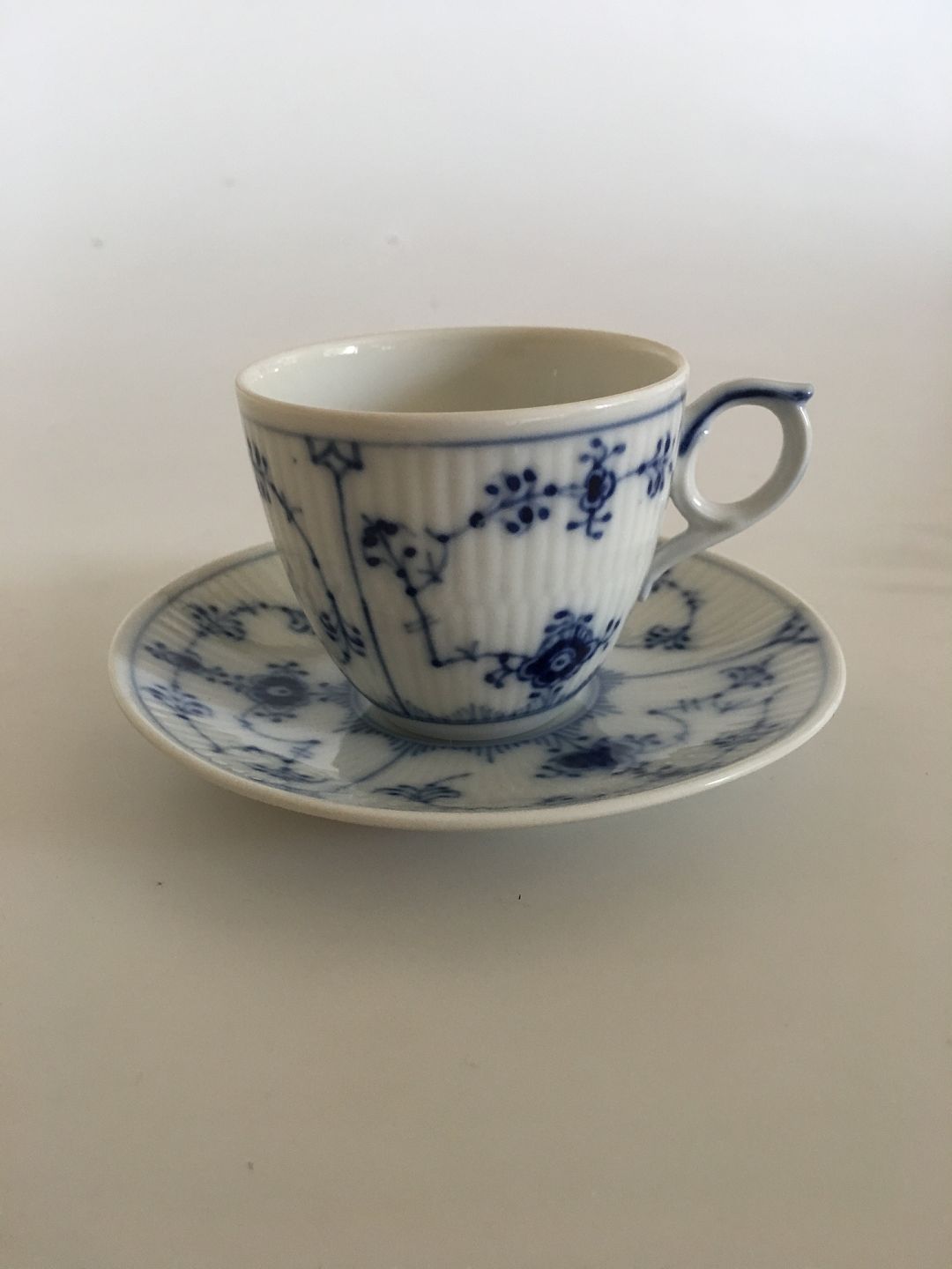 Royal Copenhagen Musselmalet Riflet Mokka Kop med Underkop No. 298. 5.3 cm Høj. 6.4 cm diameter. 1. Sortering.