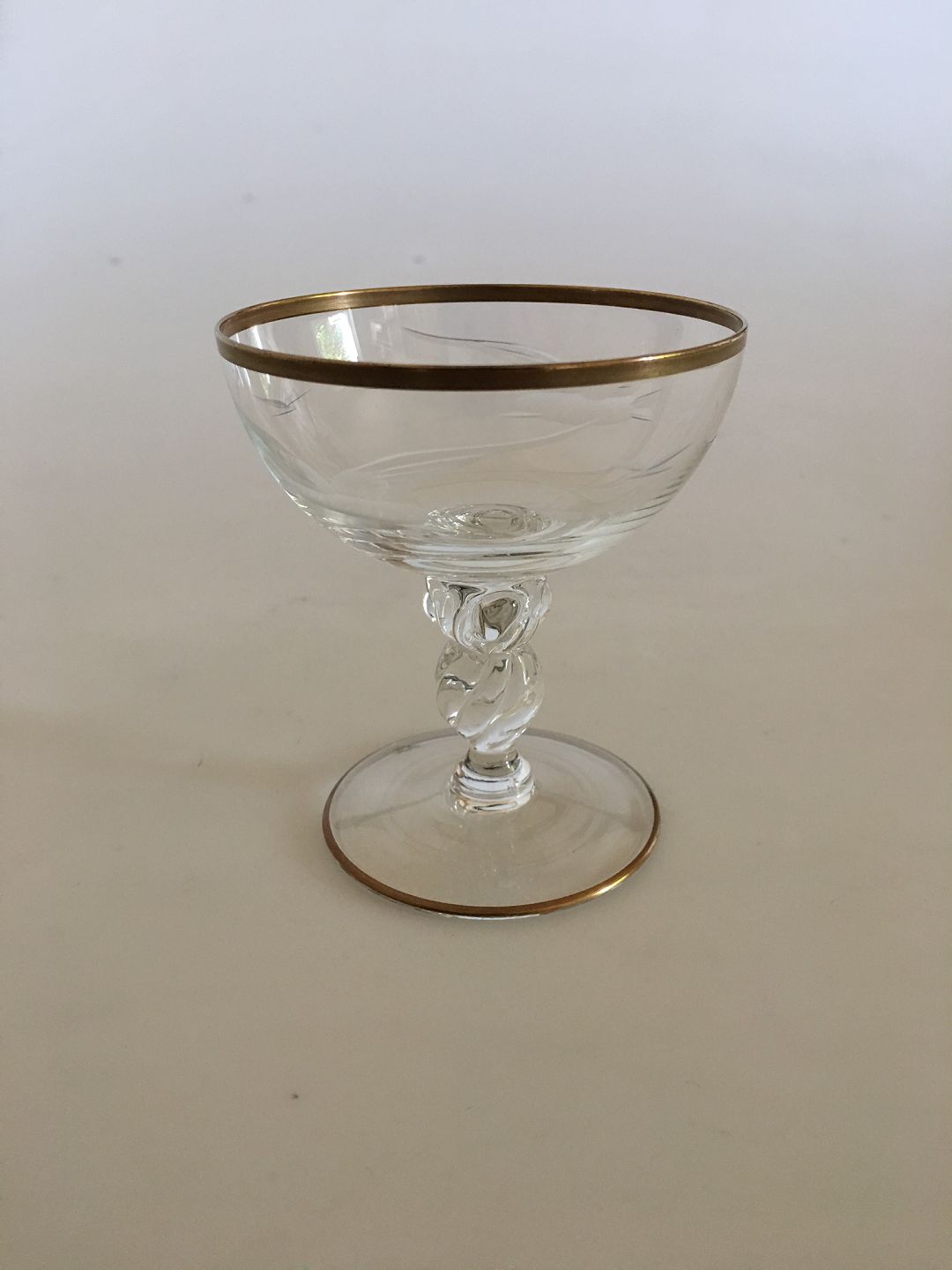 Lyngby Måge Likørskål fra Lyngby Glasværk. 7.7 cm H. 6.5 cm diameter. Håndgraveret glas med guld på kant og fod med sleben måge. Designet passer til Bing & Grøndahls Mågestel.