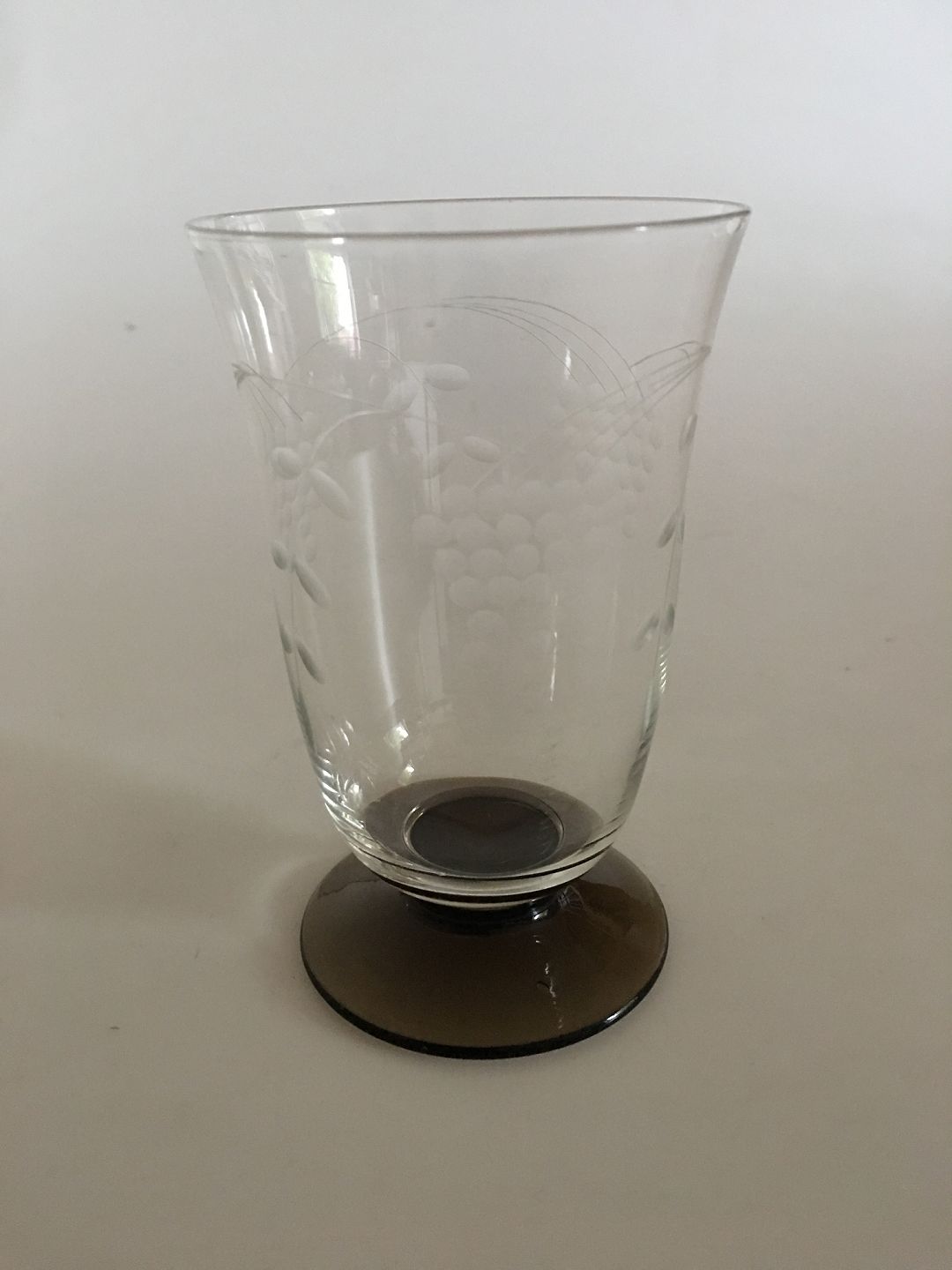 "Jane" Beer Glass with ingraved grapes from Holmegaard. Smoke to transparent foot, maybe 2nd Quality?. 12 cm H. Manufactured first in 1942.