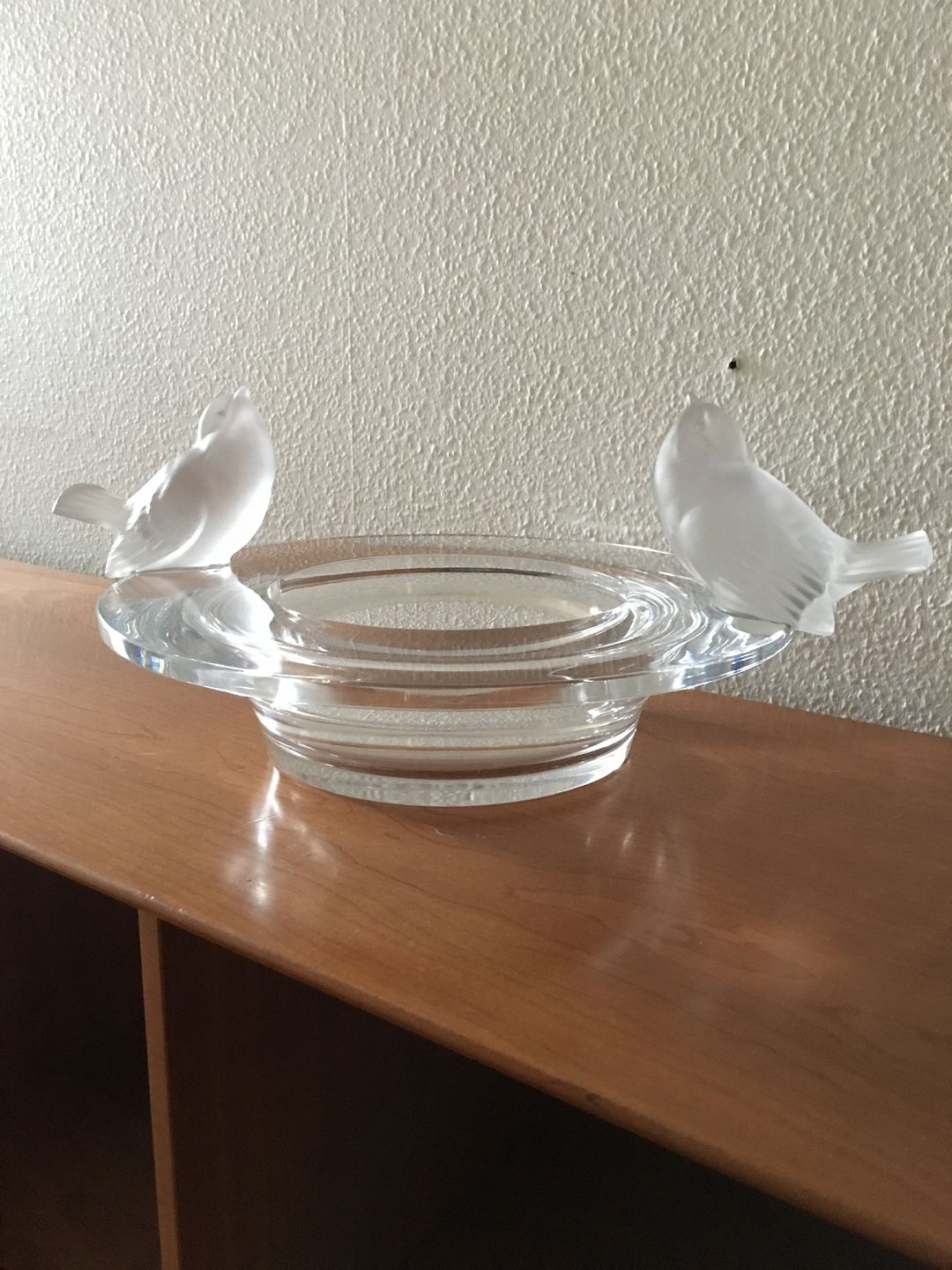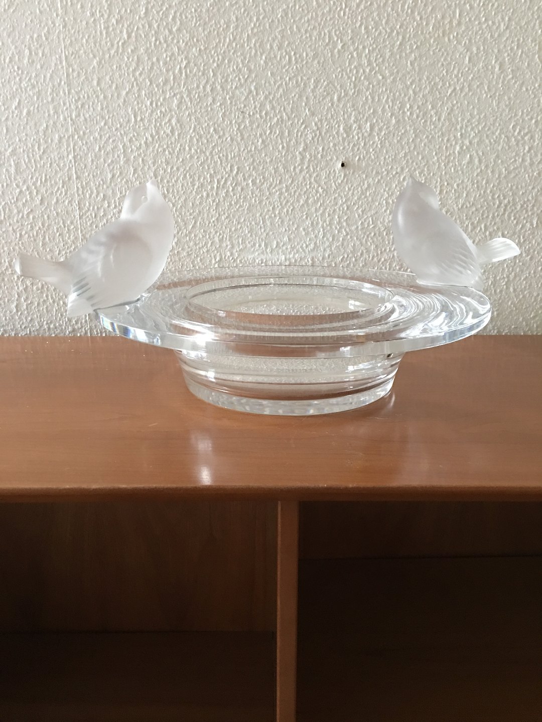 Lalique Glasskål med to Fugle. 1960'erne. Måler 30.5 cm diameter. 7.5 cm Høj. 15.5 Høj hvis målt til spidsens af fuglens næb. I flot hel stand.