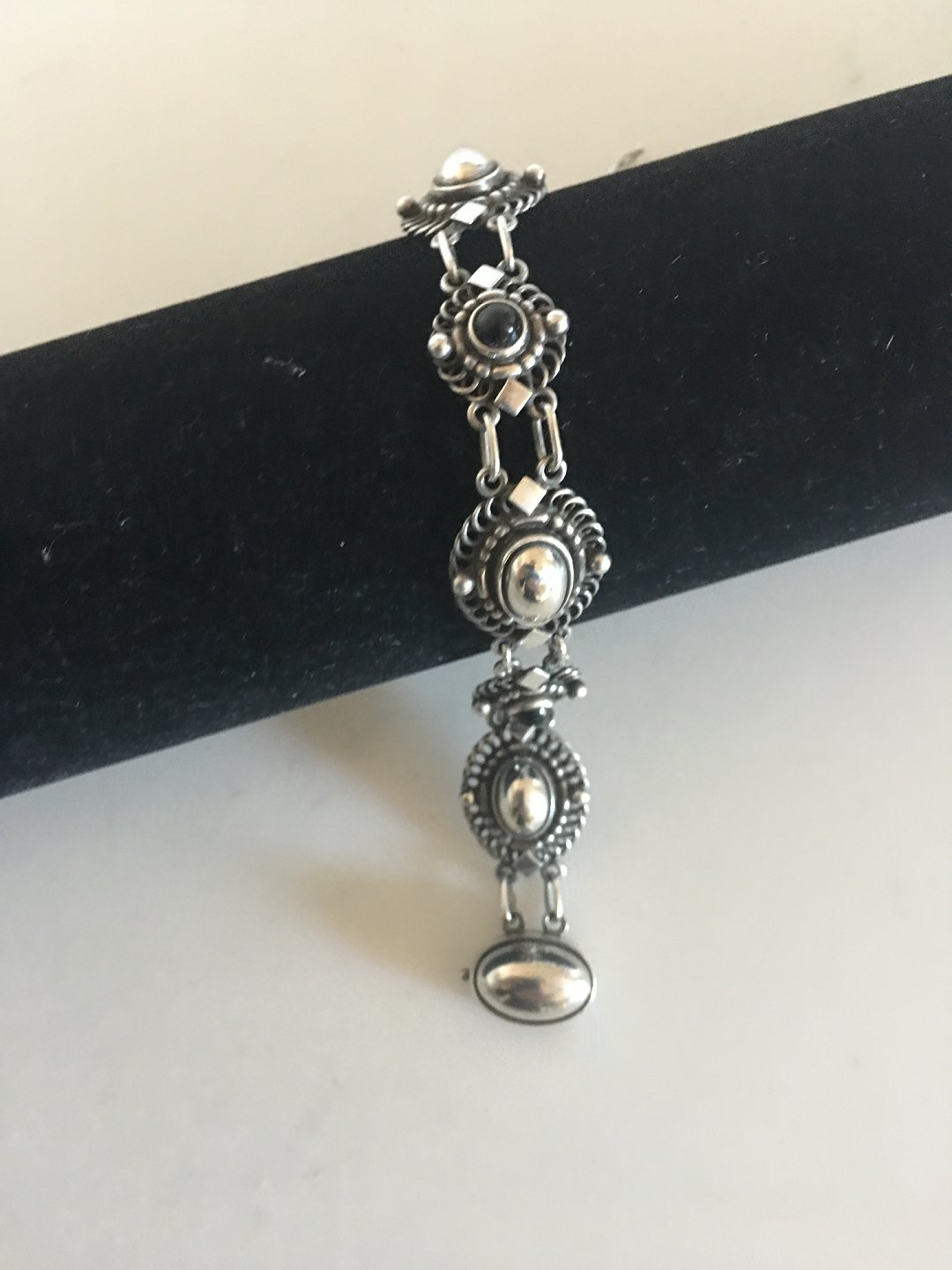 Georg Jensen Sterling Silver Bracelet No. 419 with Black Onyx Stones. Measures 19.5 cm L (7 43/64"). 1.8 cm Wide (0 45/64"). Weighs 35 grams (1.25 oz). Manufactured after 1945.
