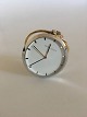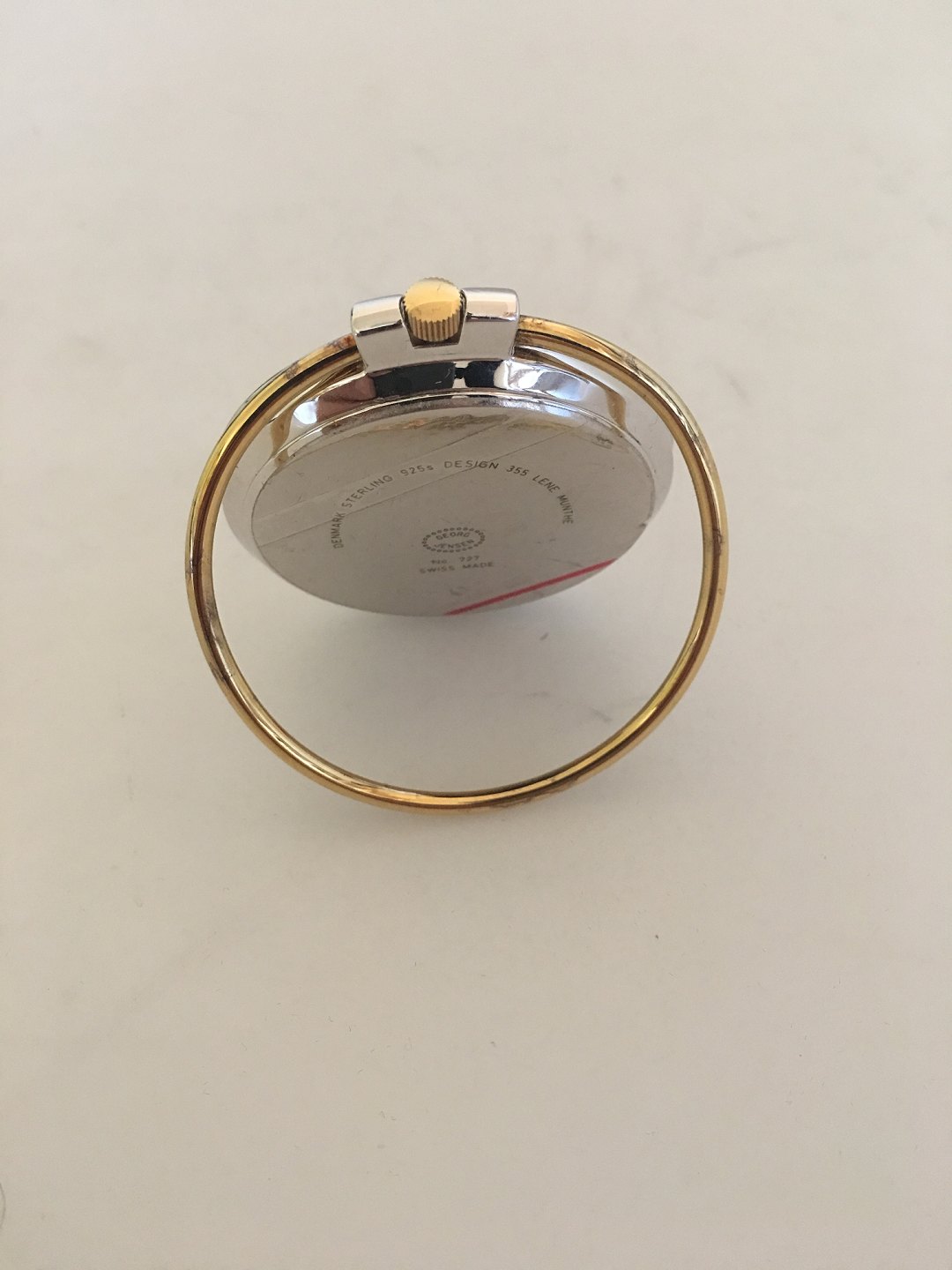 Georg Jensen Sterling Silver Pocket watch / Table watch No. 355 designed by Lene Munthe. With gilded round circle / standing mechanism. Weighs 89 grams (3.15 oz). Meaures 5.5 cm diameter (2 11/64").