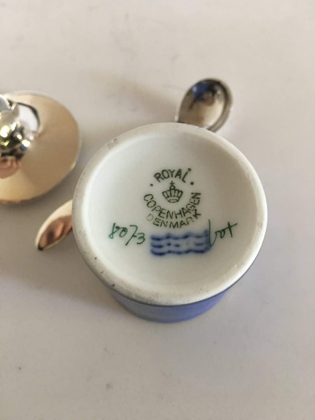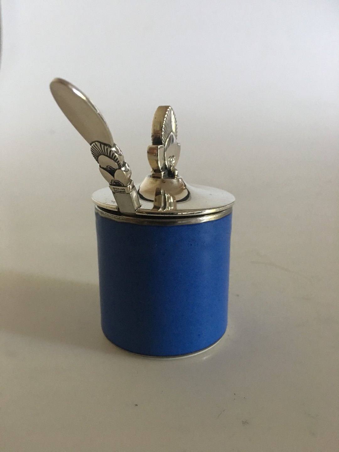 Georg Jensen / Royal Copenhagen Sennepskrukke No. 8073 med Kaktus Sterling Sølv Låg No. 815C og Kaktus Sennepsske. Krukken er 4.5 cm Høj. Låget måler 4.5 cm diameter. Låg og ske vejer tilsammen 37 gram. Produceret efter 1945.