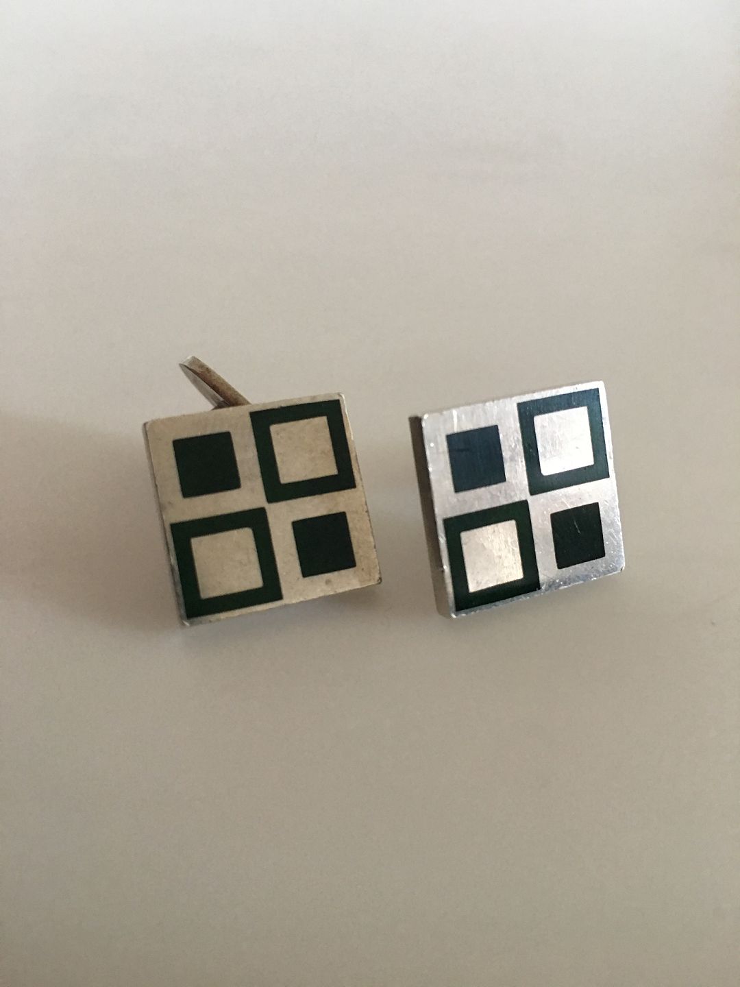 Georg Jensen Cufflinks No. 87 In Sterling Silver and Green Enamel. Designed by Magnus Stephensen. Measures 1.5 cm x 1.5 cm (0 19/32"). Combined weight of 19 grams.