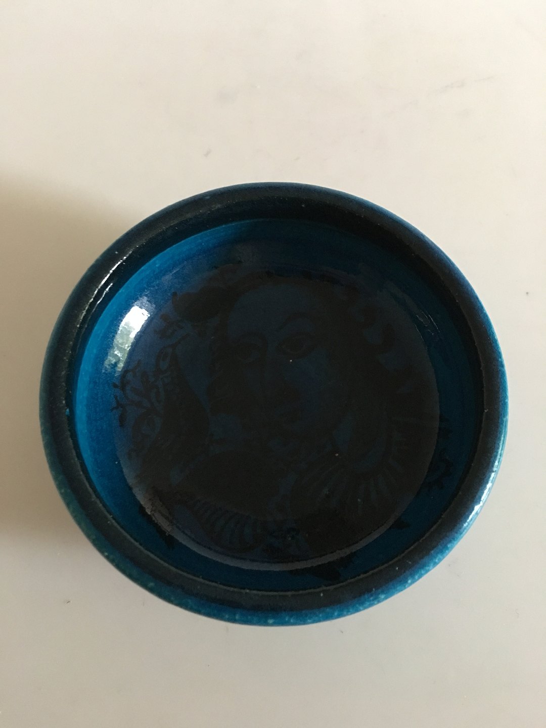 Royal Copenhagen Unique Stoneware Bowl by Nils Thorsson. Blue Glaze with Lady Portrait. 5.5 cm H. 13 cm diameter. In great condition.