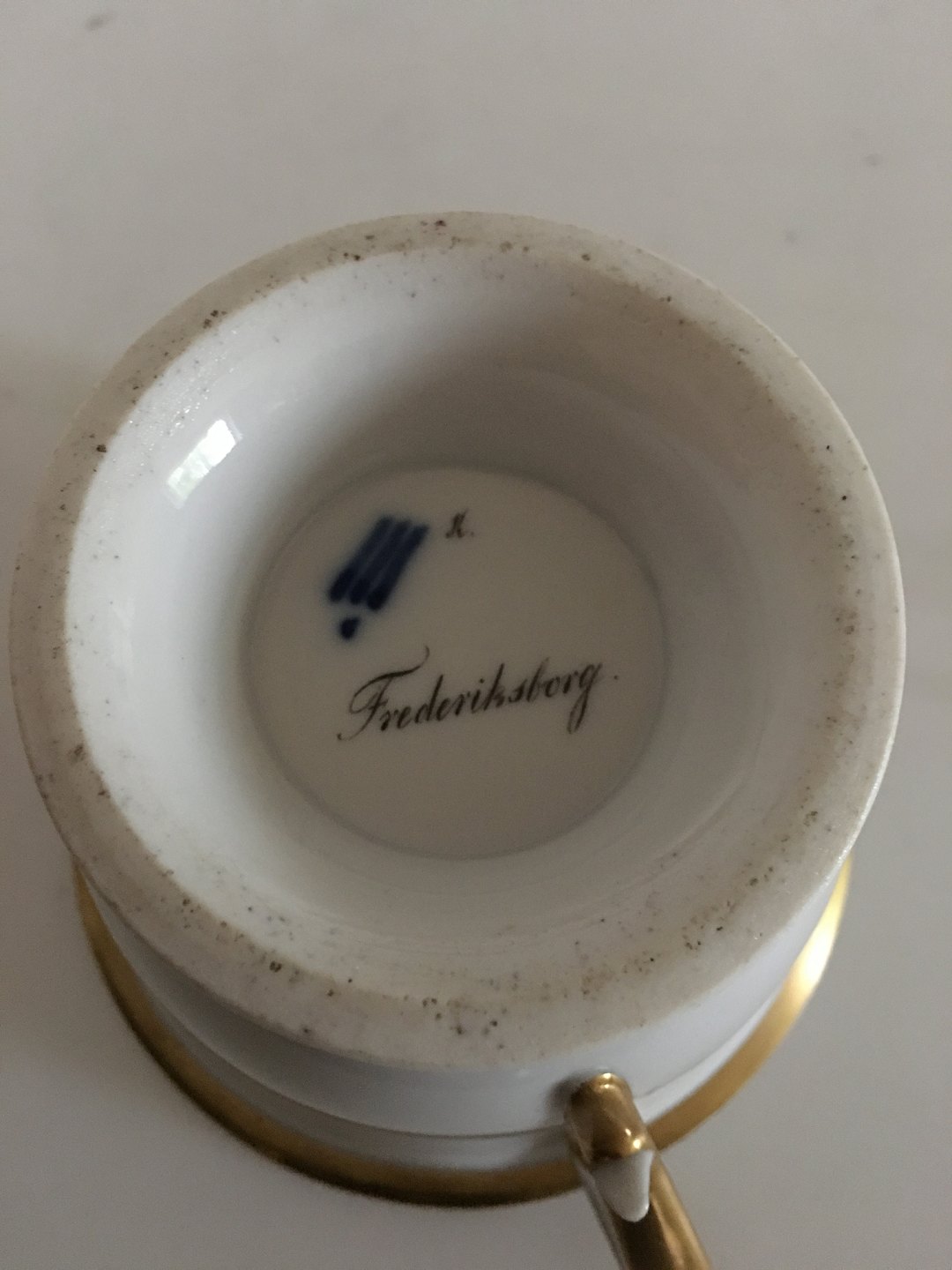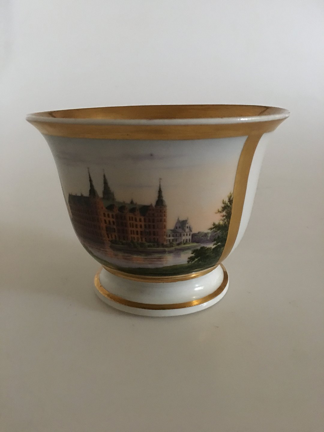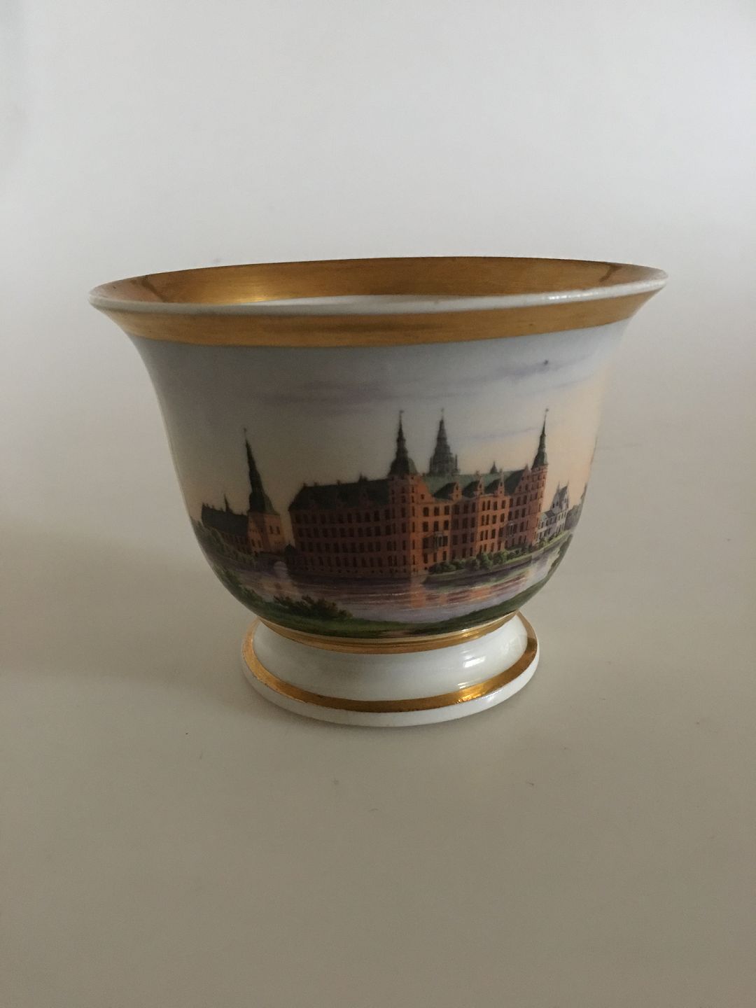 Royal Copenhagen Antique Cup with Handpainted decoration of Frederiksborg Castle. In excellent condition, without chips, scraps or wear on the gold. 9 cm H. 11.5 cm diameter.