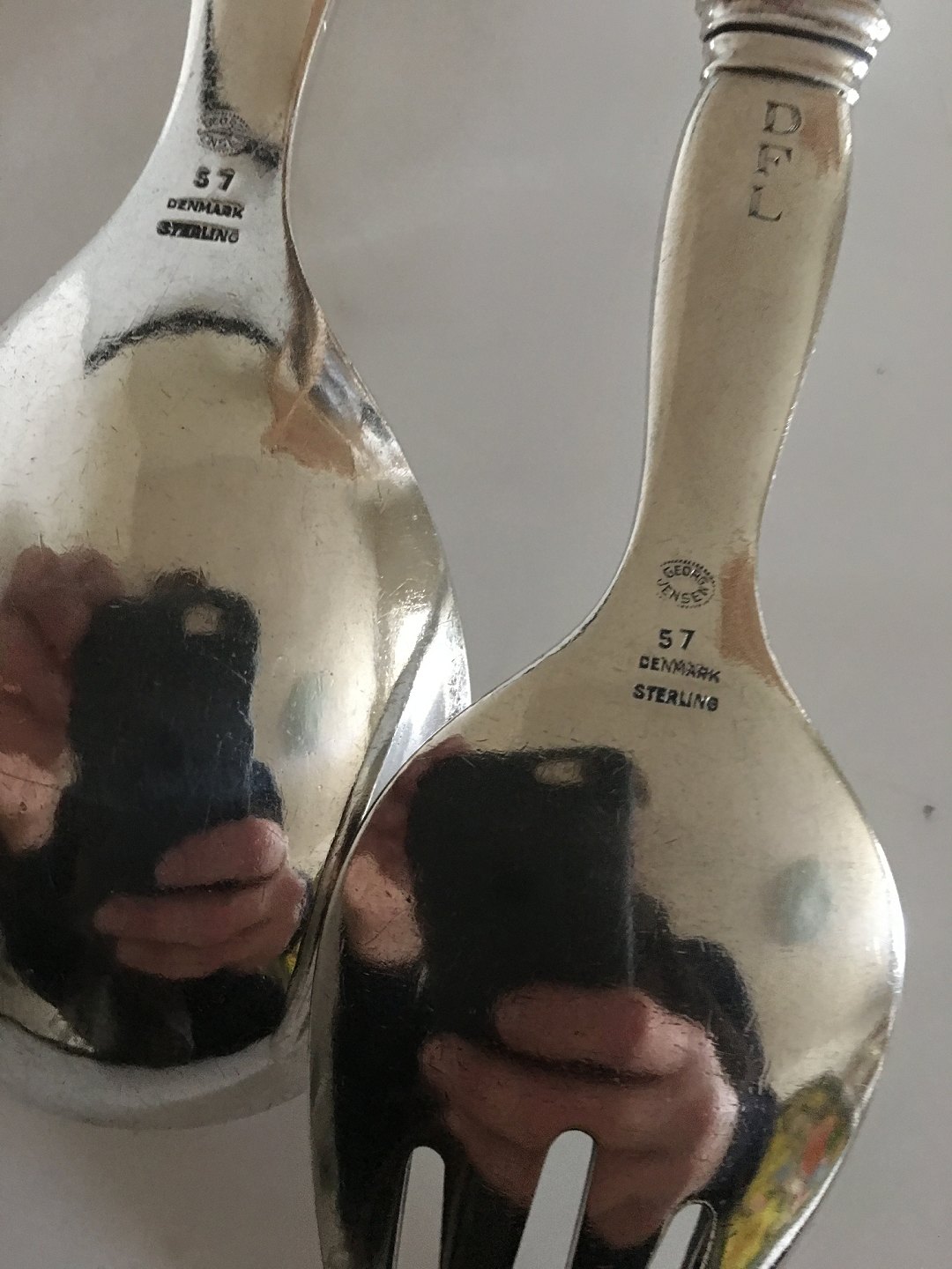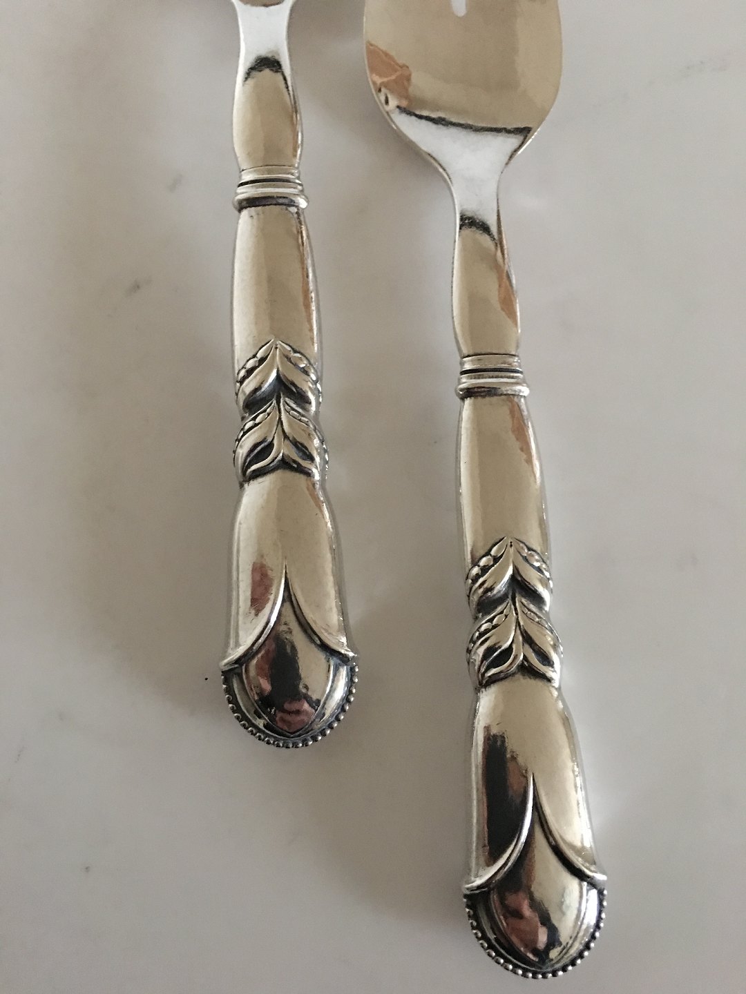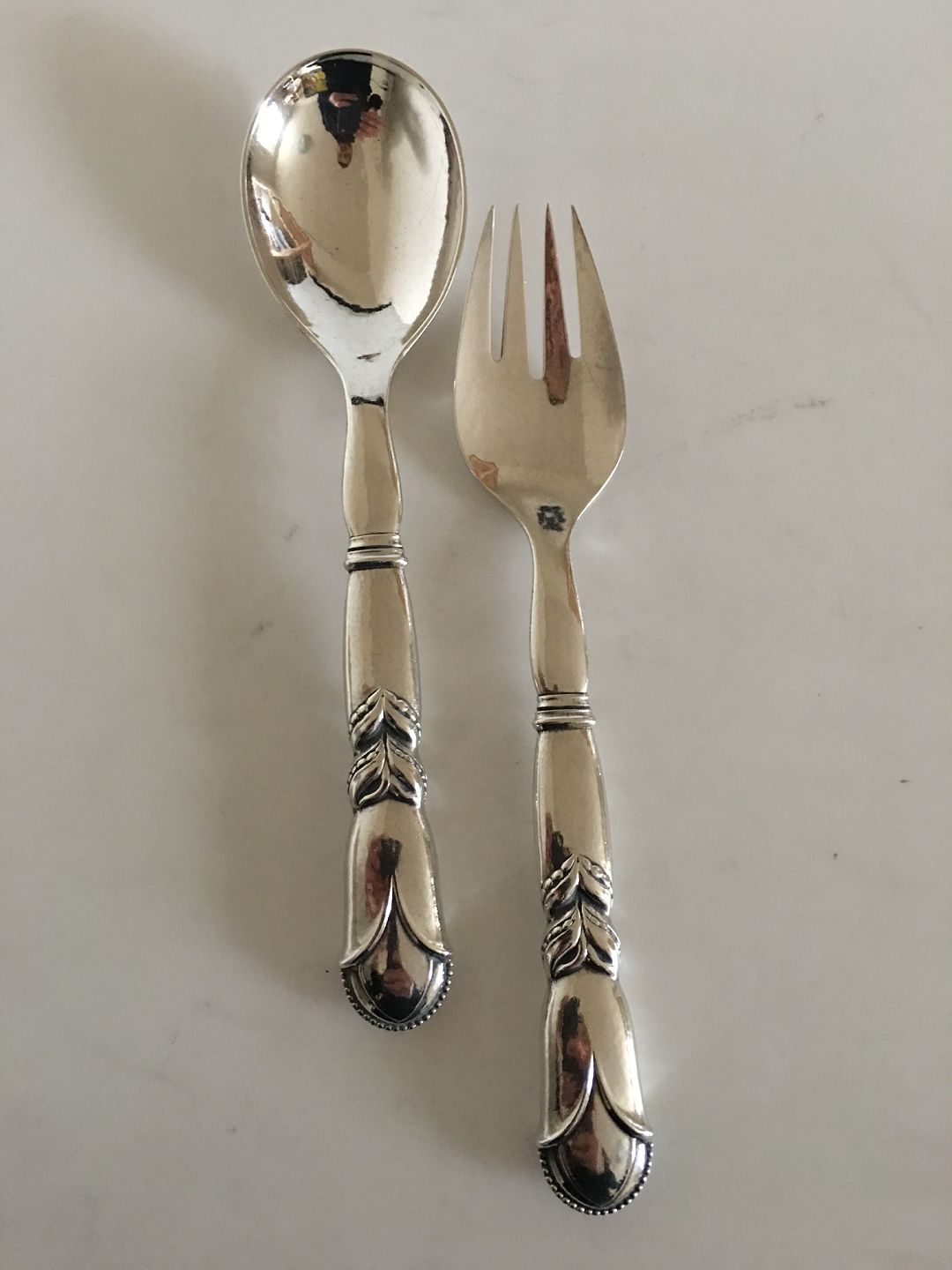 Georg Jensen Sterling Sølv Ornamental Serveringssæt No. 57. Ske og gaffel måler 22 cm L. Produceret efter 1945.