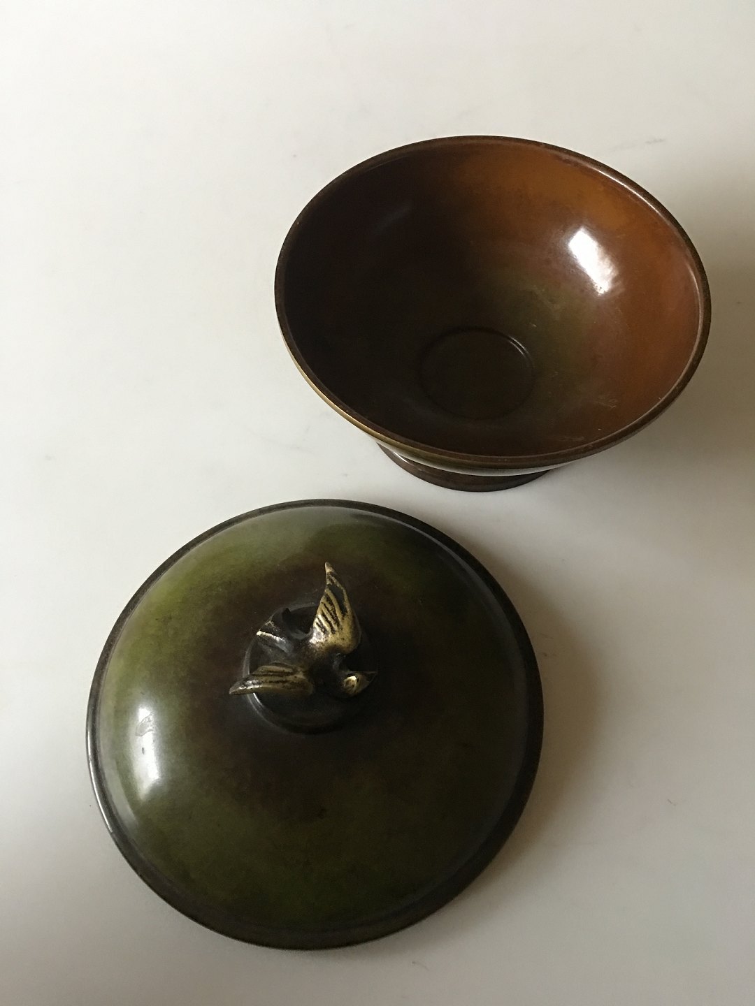Ægte Ildfast Bronze Skål med Låg pyntet med en Lille Fugl. Måler 13 cm diameter. I pæn stand.