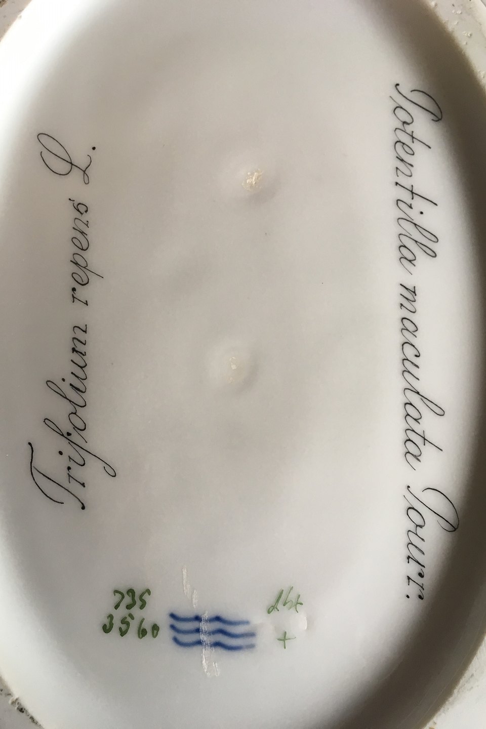 Latinsk navn på skål: Den ene side: Potentilla maculata Pourr. Den anden side: Trifolium repens L.