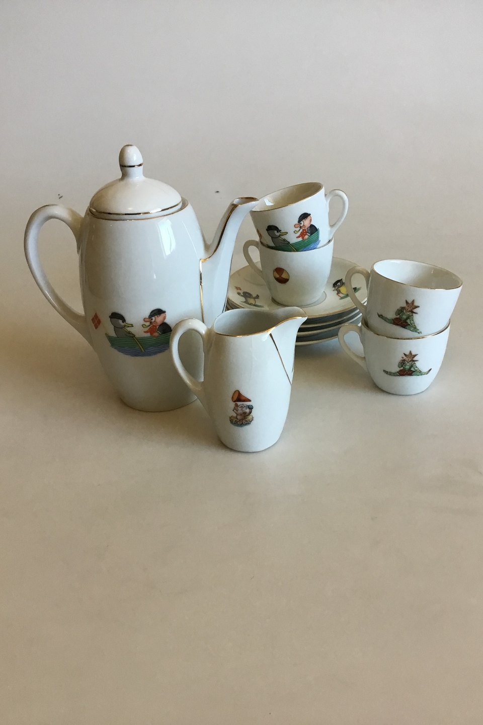 Schwarzenhammer Bavaria porcelæn Storm P´s figurer Peter & Ping Dukkestel Storm P´s figurer Peter & Ping. Består af 4 par dukkekopper, kaffekande og mælkekande. Fra ca. 1930.