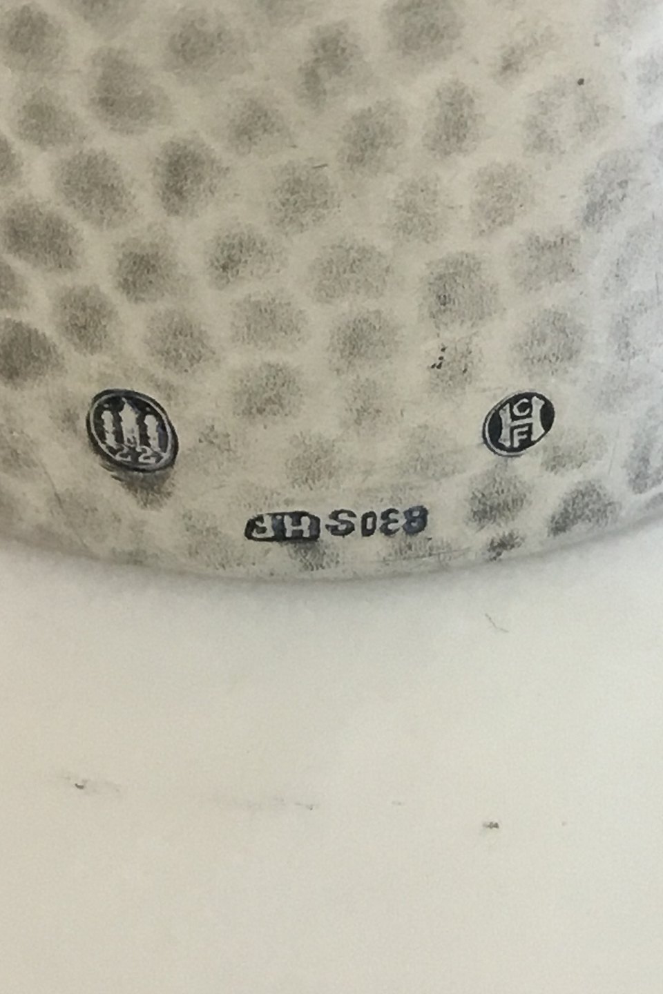 Hammerslået Servietring 830 S. Mærket H.F fra 1922. Antageligt H. Fischer København. Måler 4,3 cm dia. x 3 cm. Vejer 13,5 gram