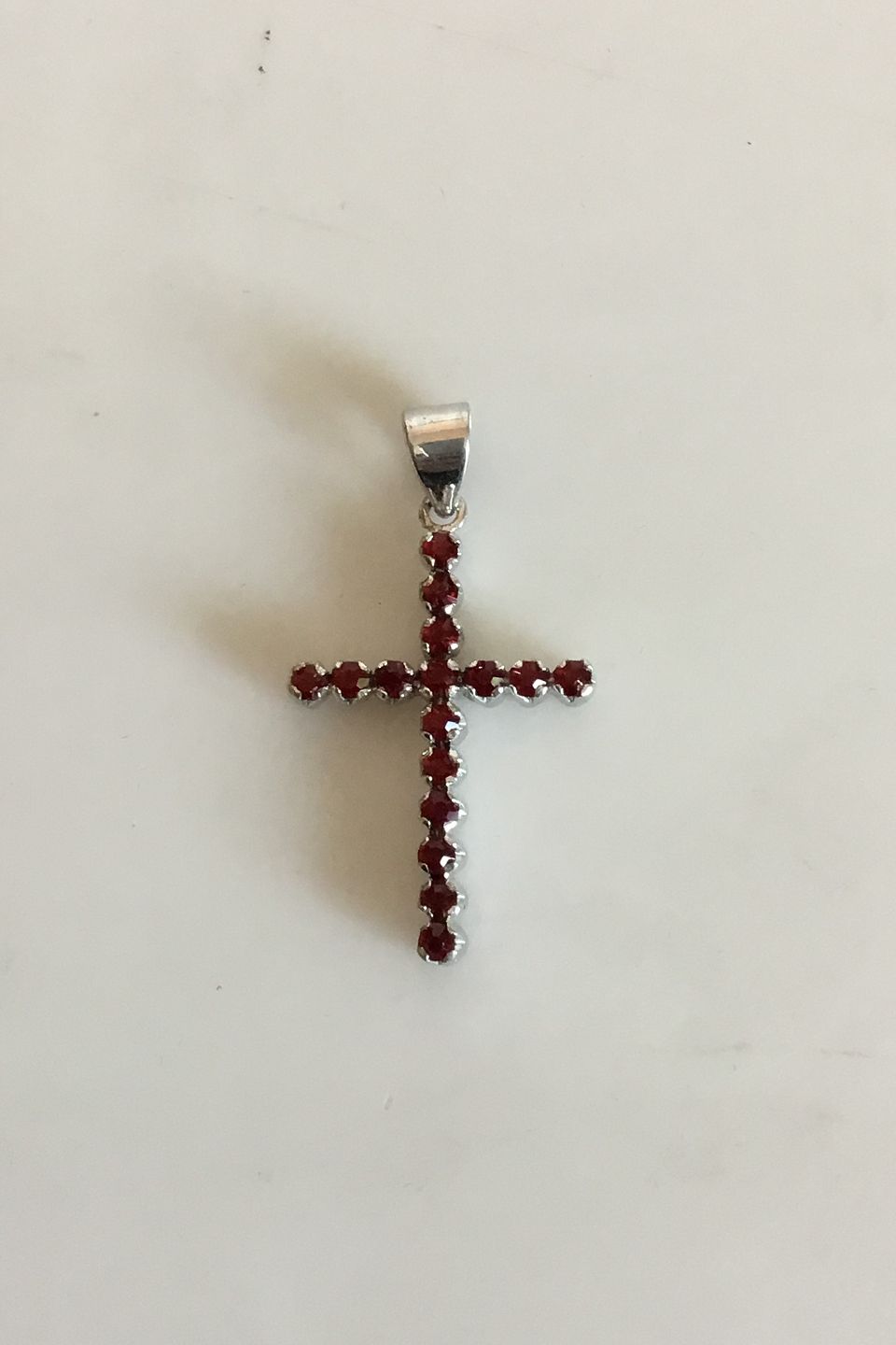 Pendant in 18 K. White gold shaped like cross with 16 red stones. Measures 3.5 cm / 1 3/8 in. x 2 cm 0 25/32 in. Weighs 3.1 g / 0.11 oz.
