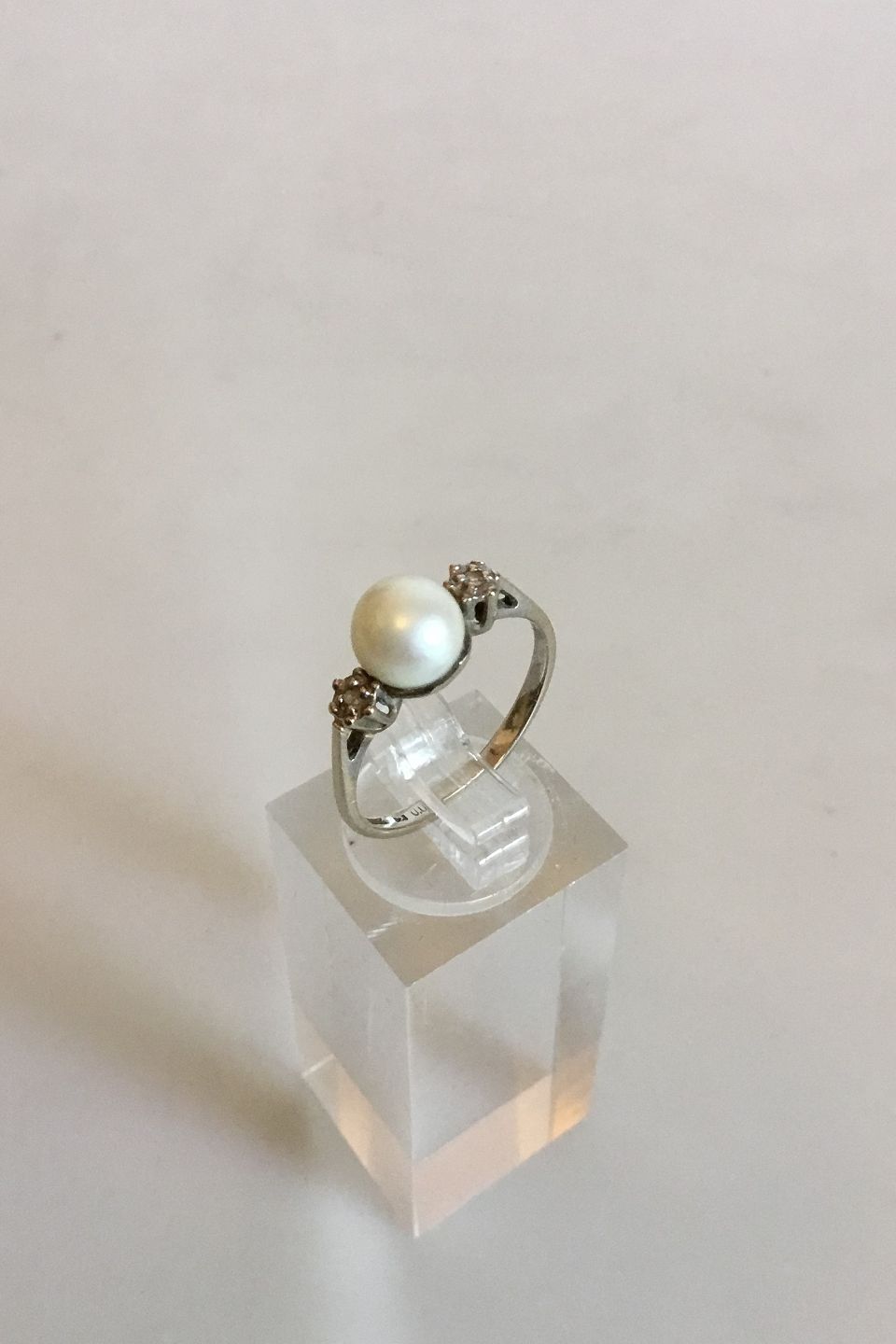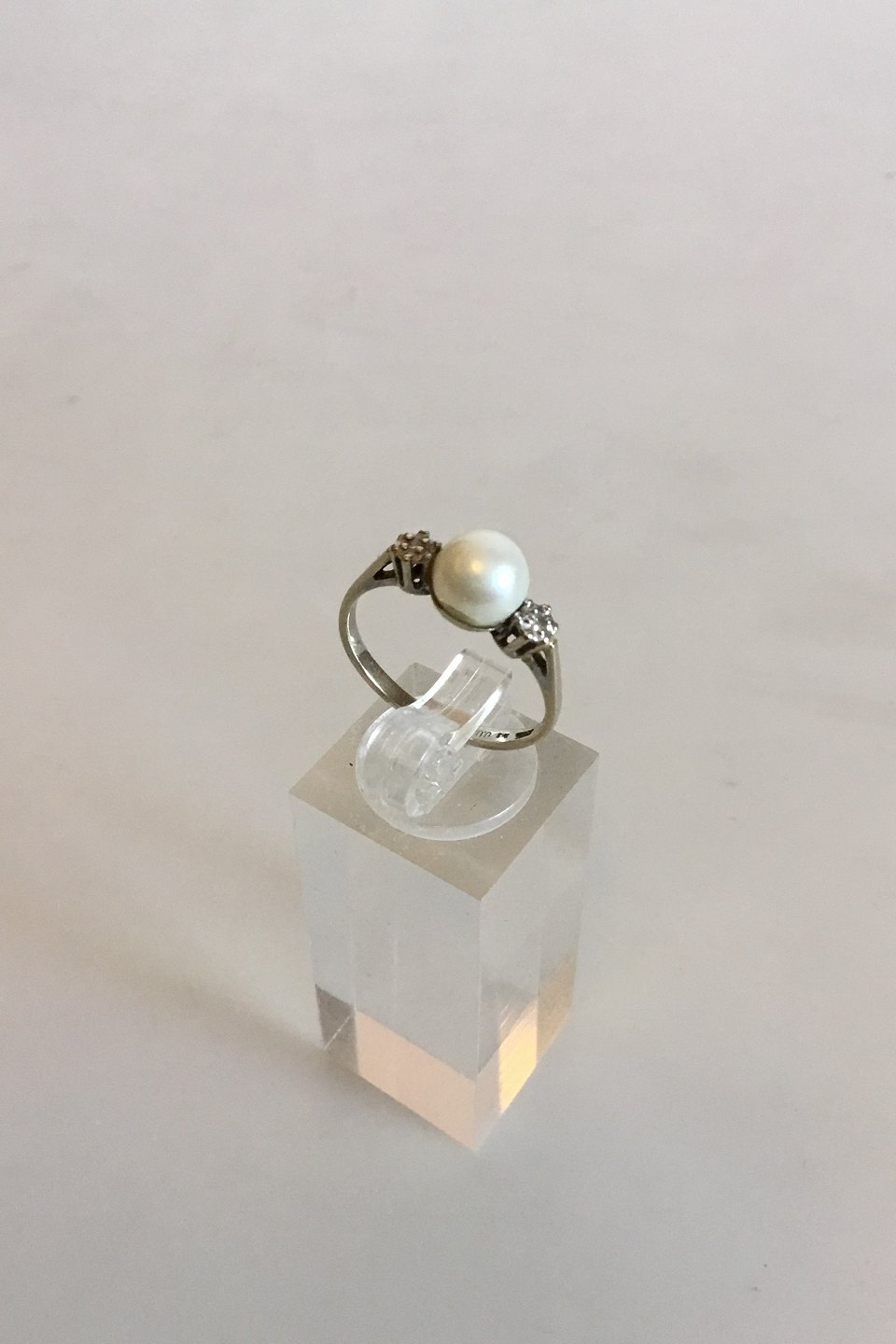 Ring in 14 K White Gold with Pearl and two small Brilliants. Ring Size 51 / US 6. Weighs 2.17 g / 0.078 oz. Stamped Br.J 585 (Bræmer-Jensen)