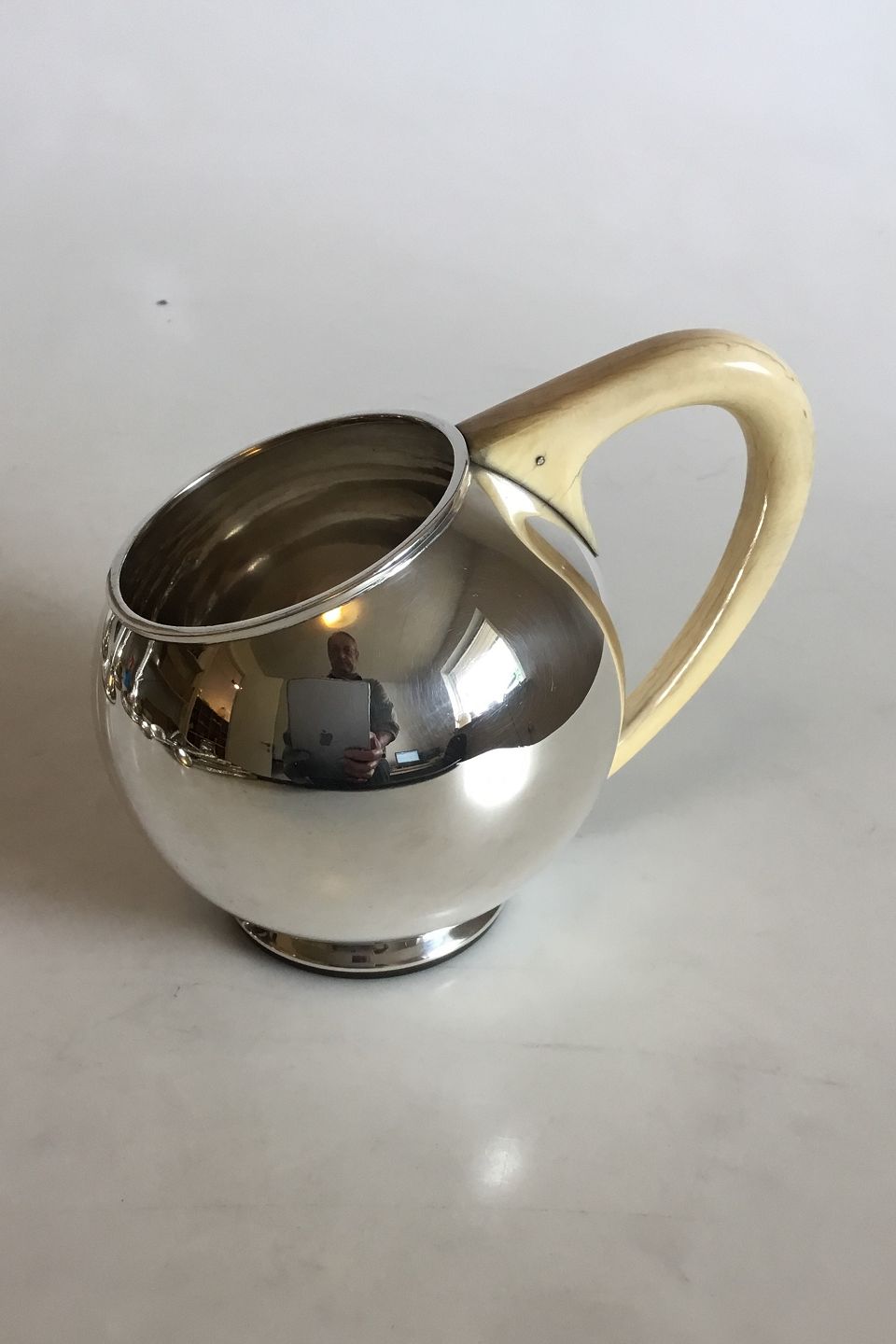 F. Hingelberg Aarhus Sterling Silver Spherical Pitcher with Handle of Bone. Measures 12.8 cm / 5 3/64 in. x 11.5 cm / 4 17/32 in. Weighs 352 g / 12.40 oz.