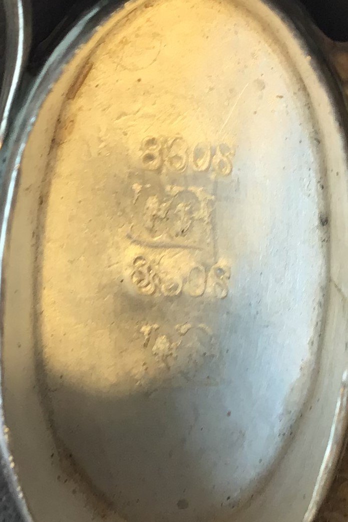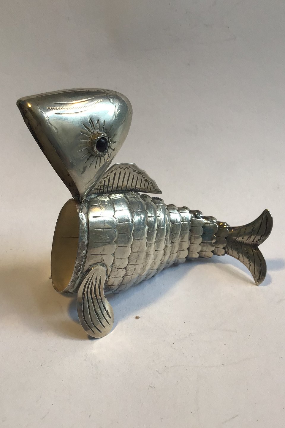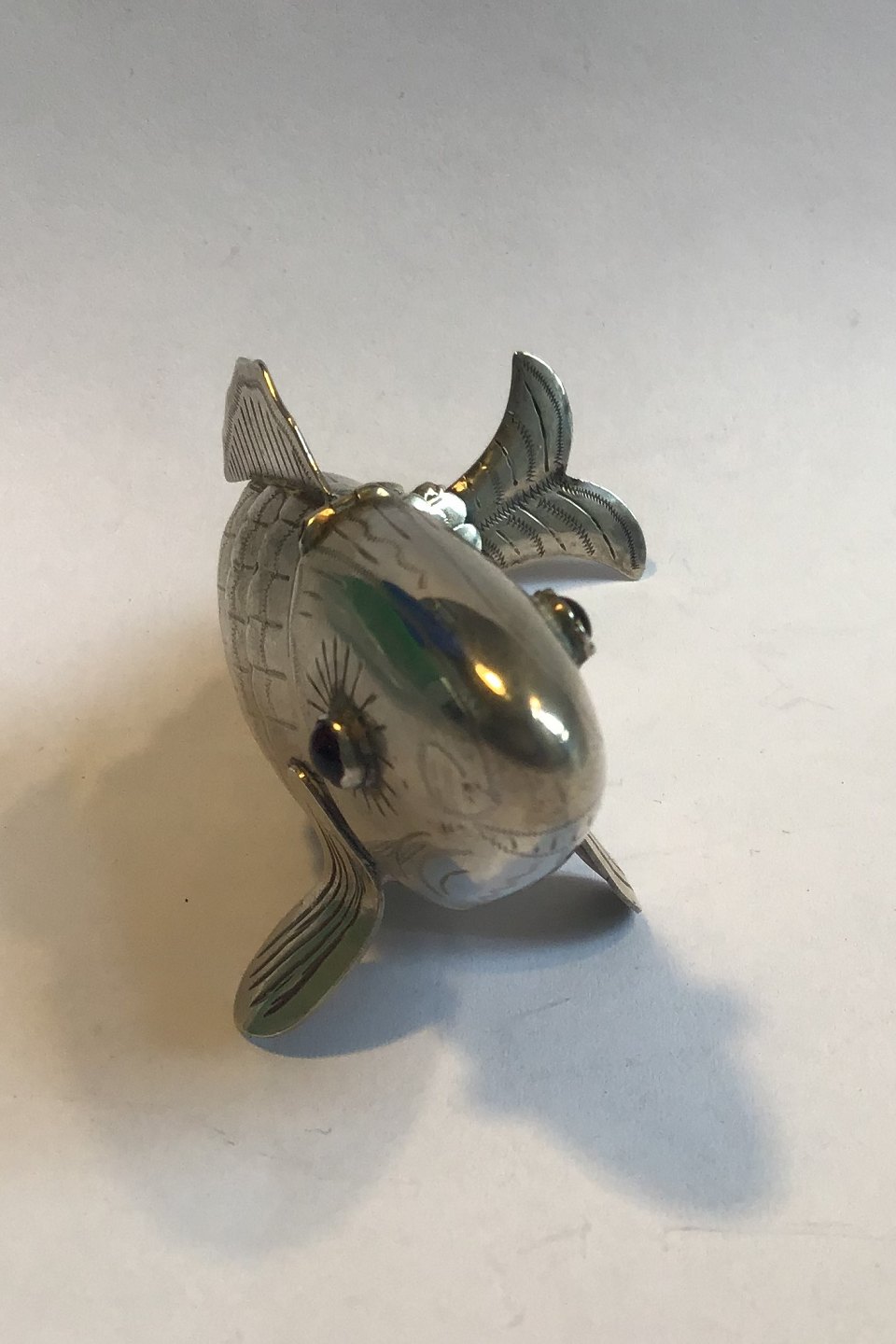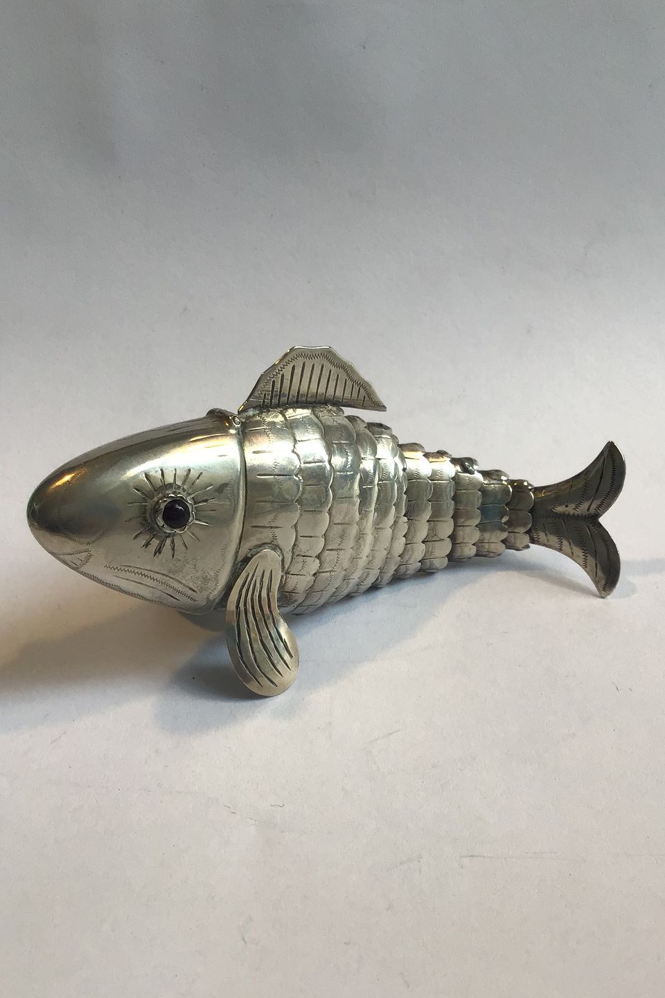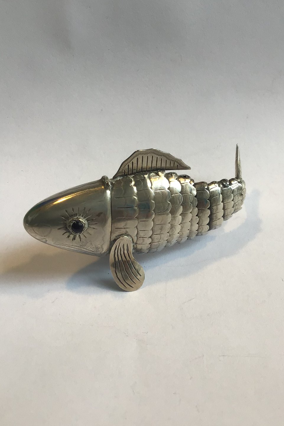 Fishshaped silver vinaigrette with moving body and eyes of glass flakes. Openable head and mouth. 1900. Hallmarked Inside 830S. L. 9.5 cm. Weight. 26.8 gr.