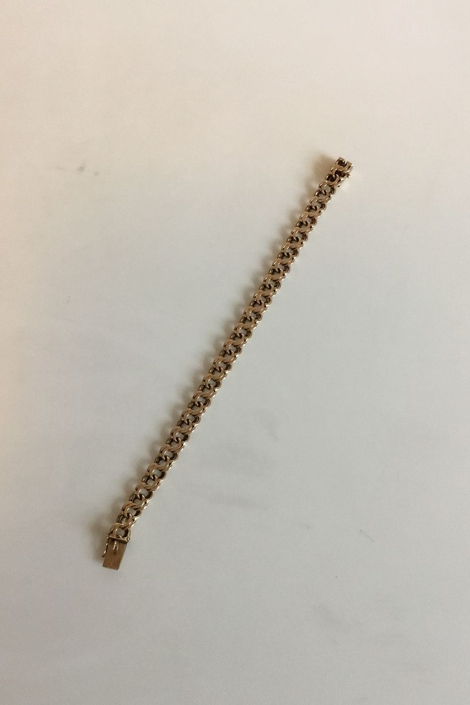 Bismarckkæde i 14 K. guld. Stempler 585. Måler 21,6 cm og er 0,9 cm bred. Vejer 28,2 gram